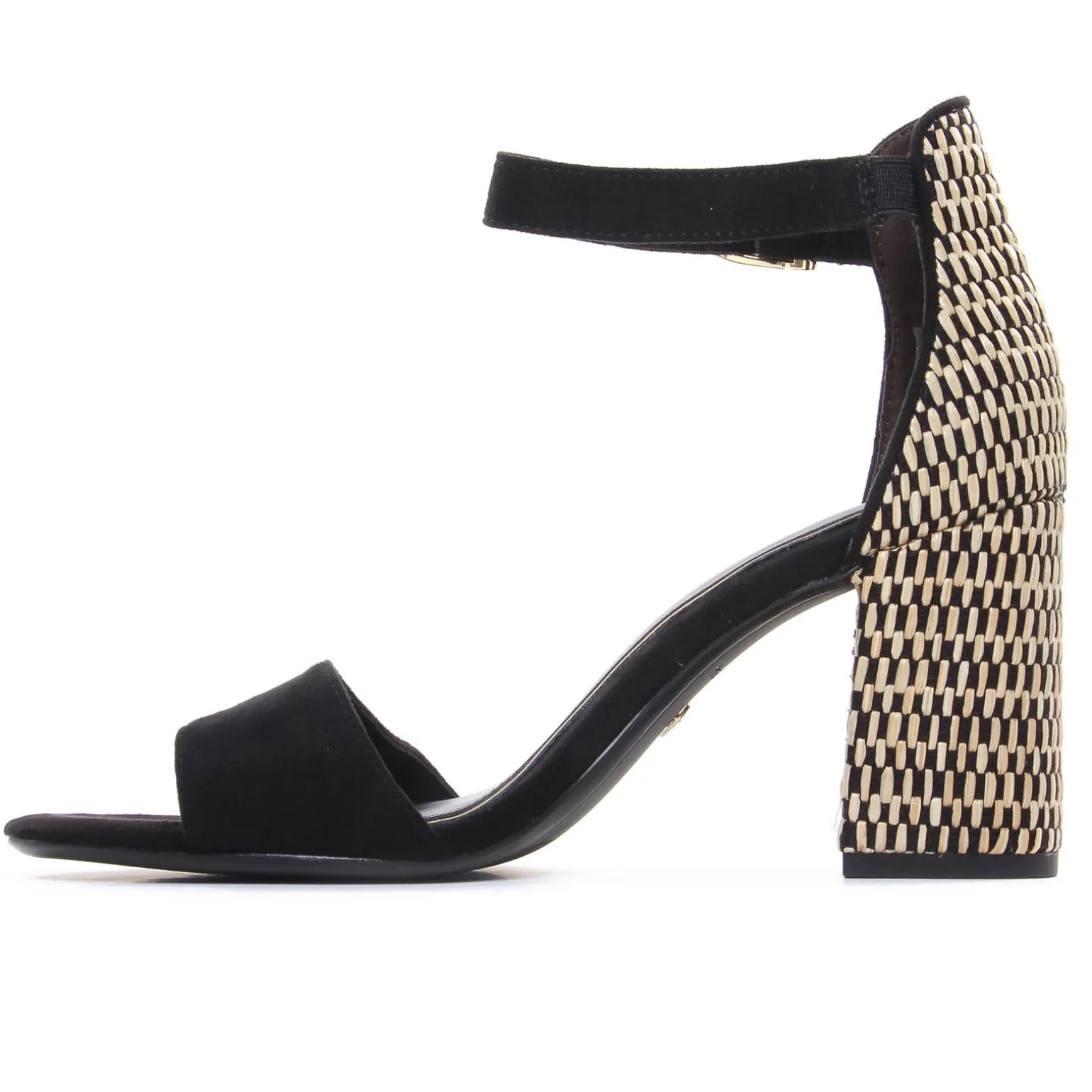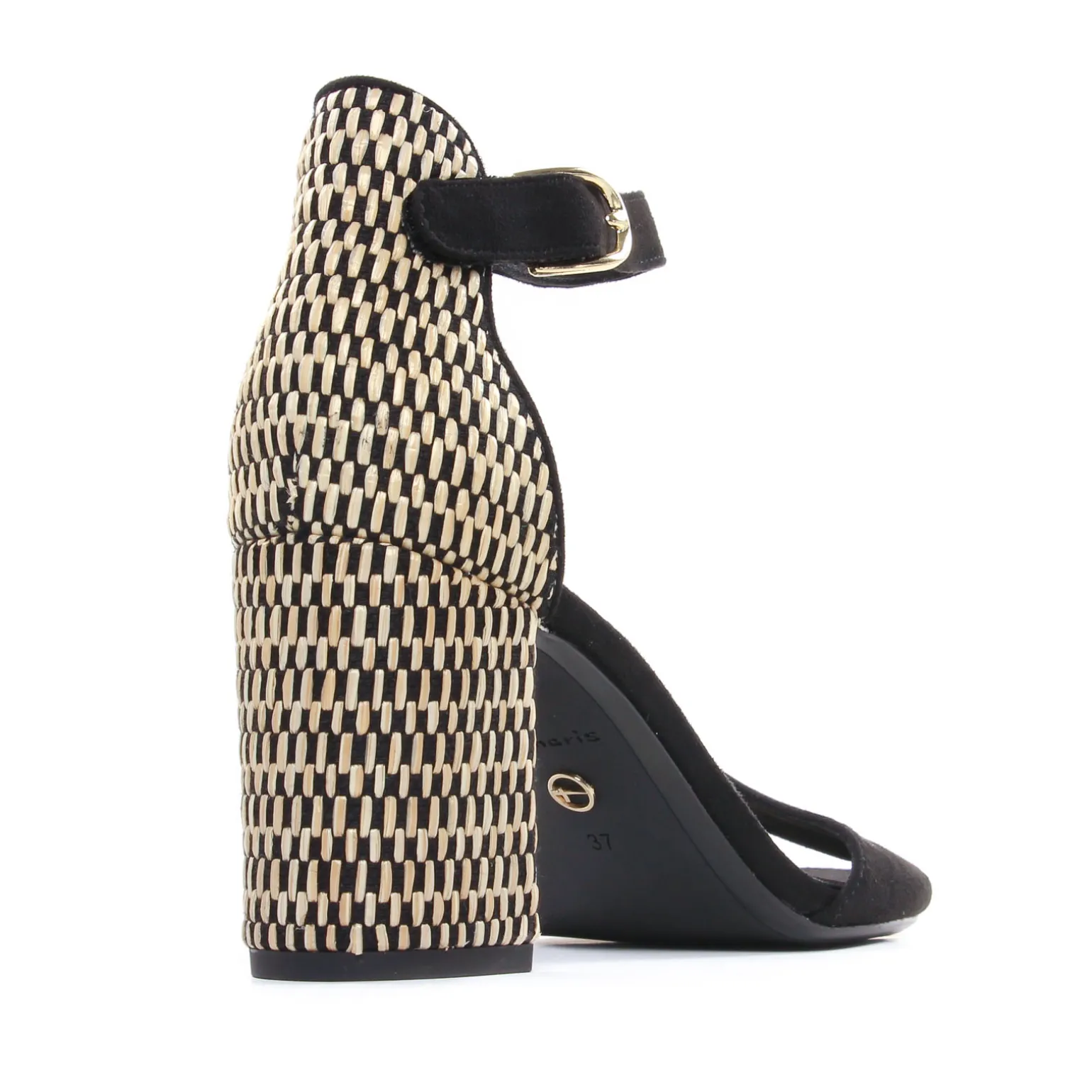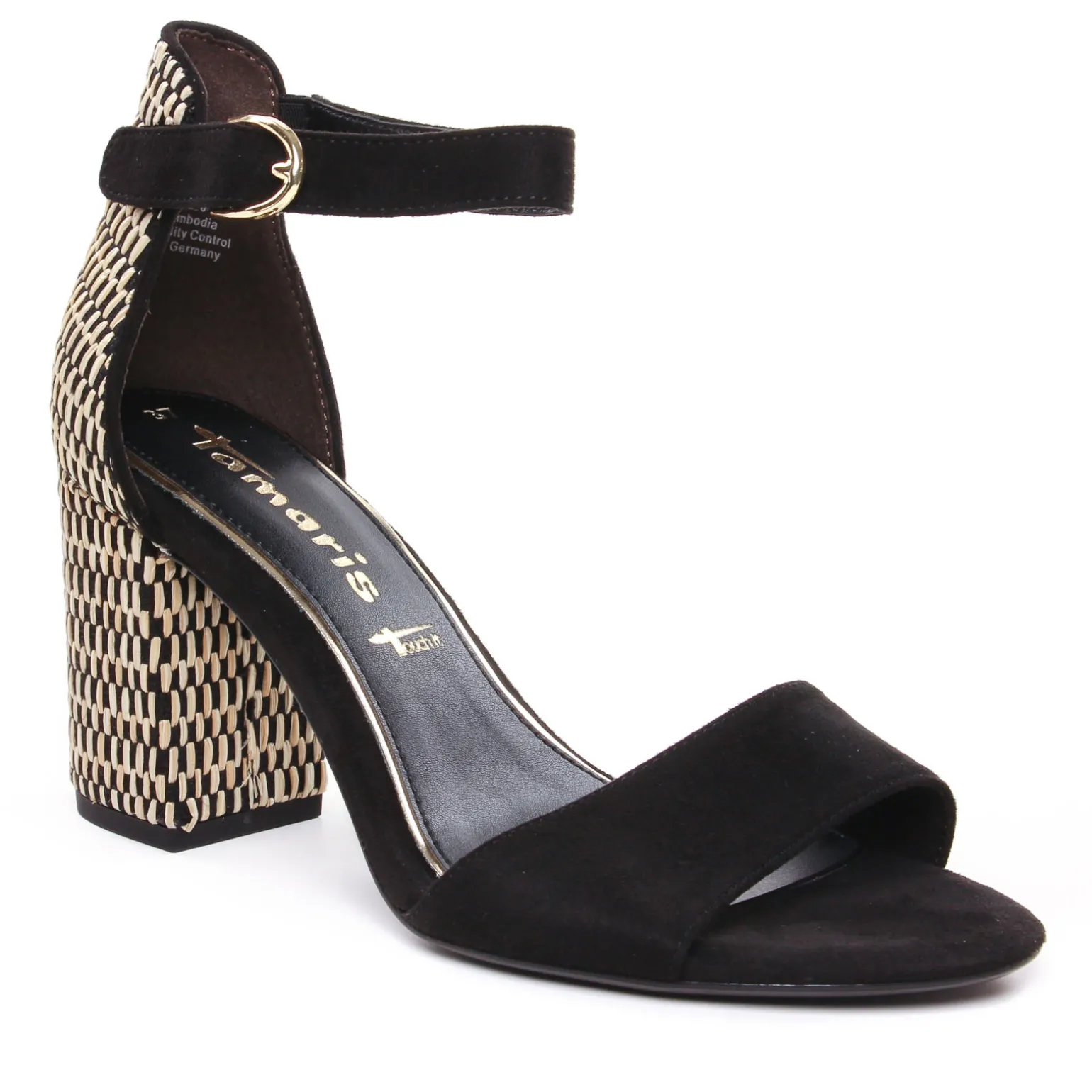 Nu-Pieds Talons Hauts de la marque Tamaris de couleur noir beige. Superbes nu-pieds à talon haut de 9 cm, il revient pour cette nouvelle collection 2024 de la marque de chaussures allemande Tamaris avec une version en velours noir, contrefort et talon massif recouvert d’un textile inspiration raphia, une claque en textile velours rouge, nu-pieds au design moderne, original et tendance, bride autour de la cheville réglable par un scratch et ajustable avec un petit soufflet. Première confortable Touch It.