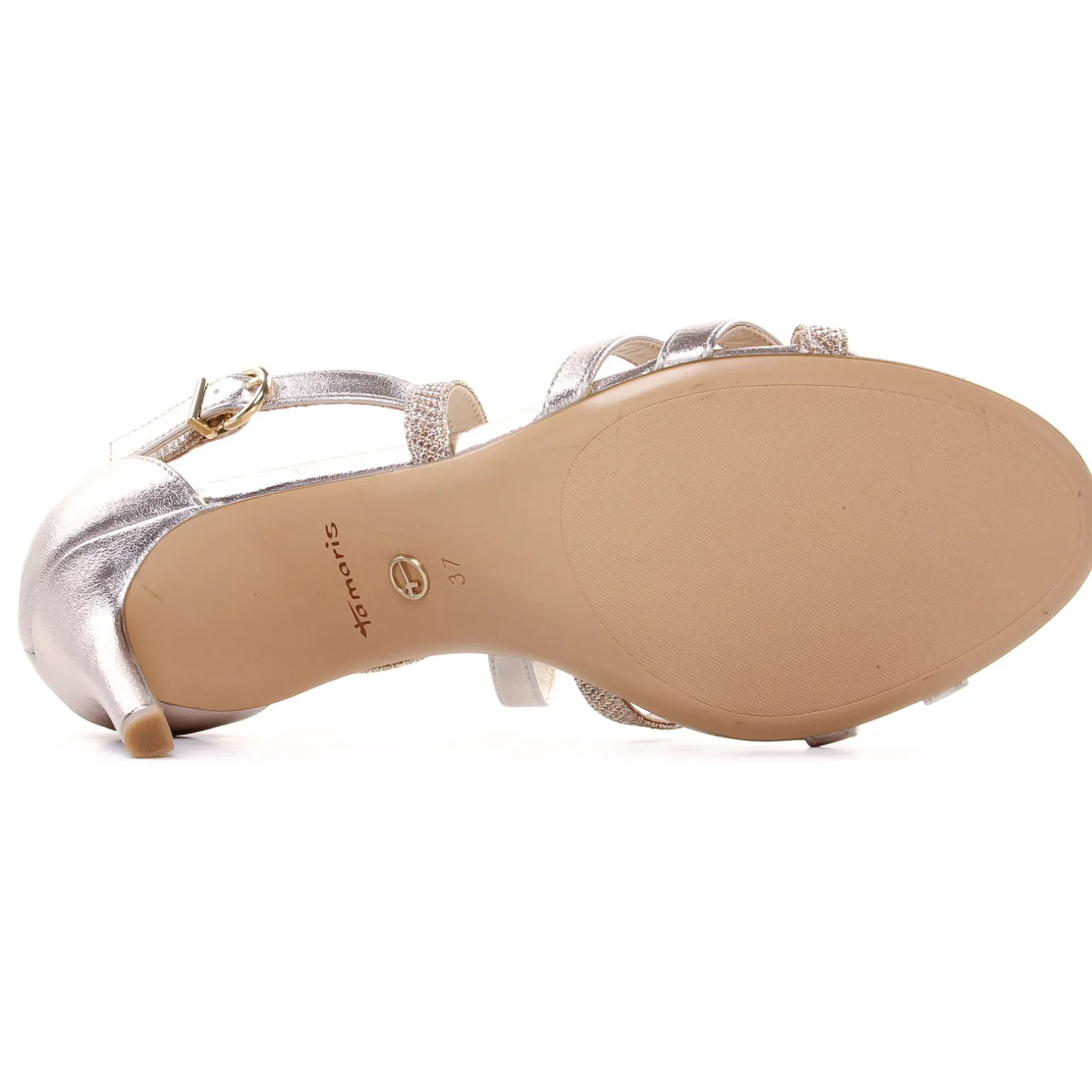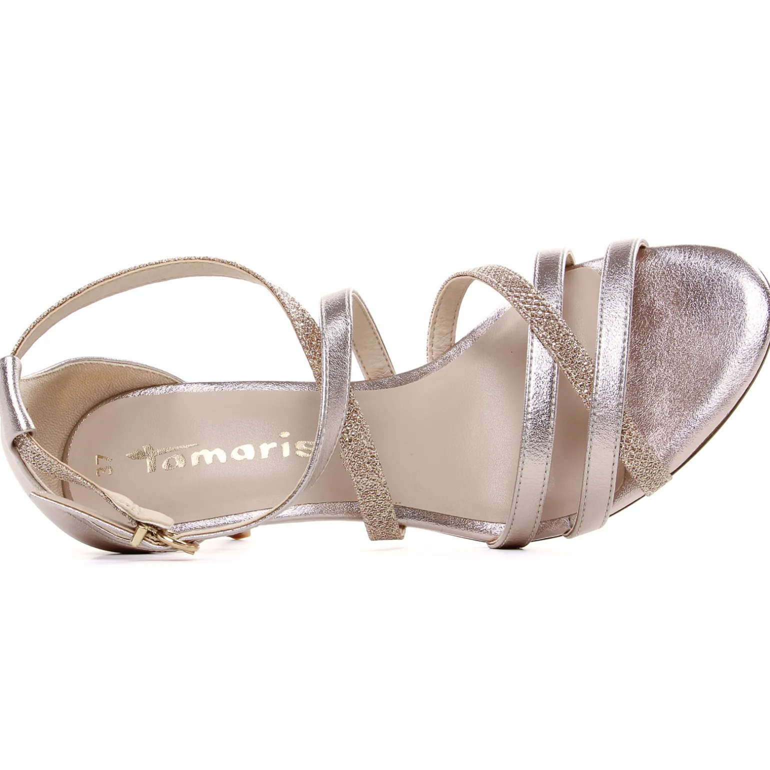 Nu-Pieds Talons Hauts de la marque Tamaris de couleur or. Parfaits pour une fête habillées, nu-pieds escarpins glamours et chics, un talon haut fin de 8 cm, 2 brides qui s’entrelacent sur le dessus du pied, réglable avec une petite boucle, une première ergonomique pour amener du confort !
