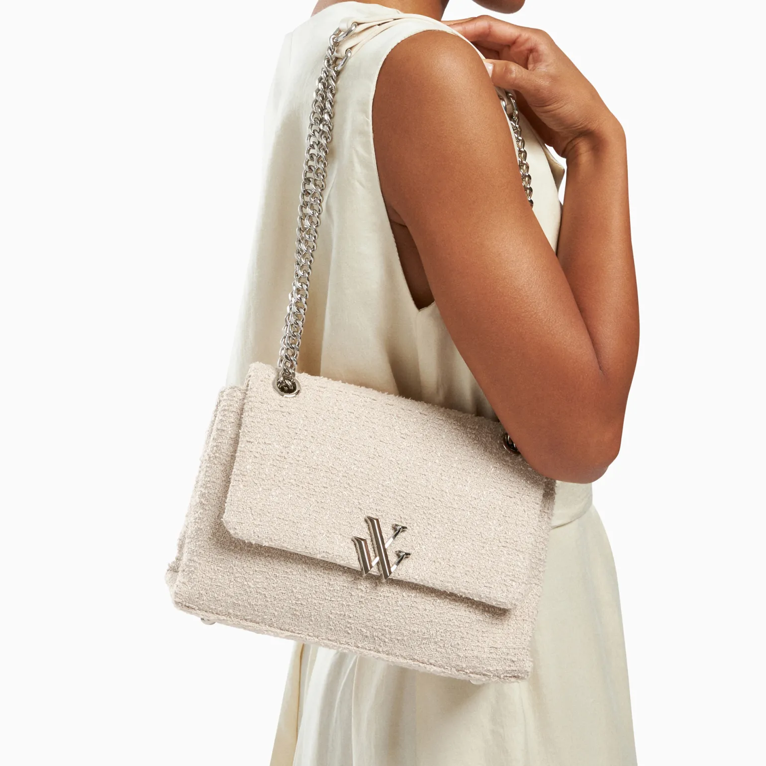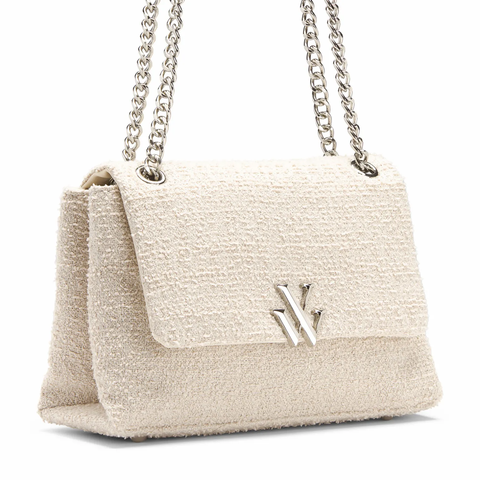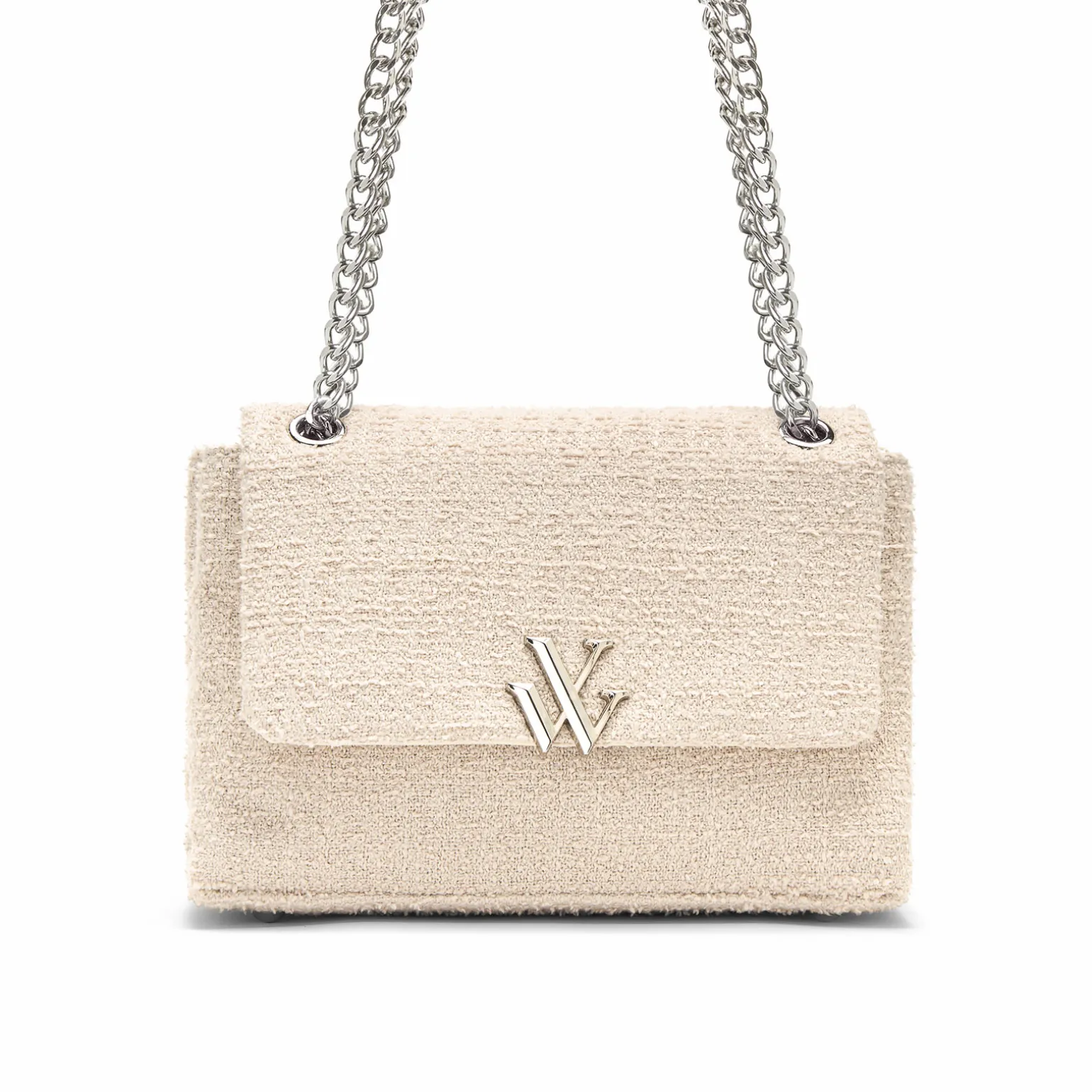 Sac À Main de la marque Vanessa Wu de couleur beige. Hyper glamour avec une petite touche bohème avec sa toile tressée paillettée, le glam amené par sa bandoulière en chaine doré, le logo de la marque tendance du moment doré également, fermeture avec un bouton magnétique, sacs de la nouvelle collection été 2025, un design rectangulaire chic, fermeture à rabat avec bouton magnétique encastré, à l’intérieur su sac à main 2 compartiments qui incluent une poche ouverte et une à fermeture éclair.