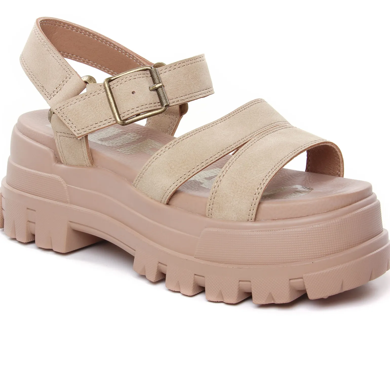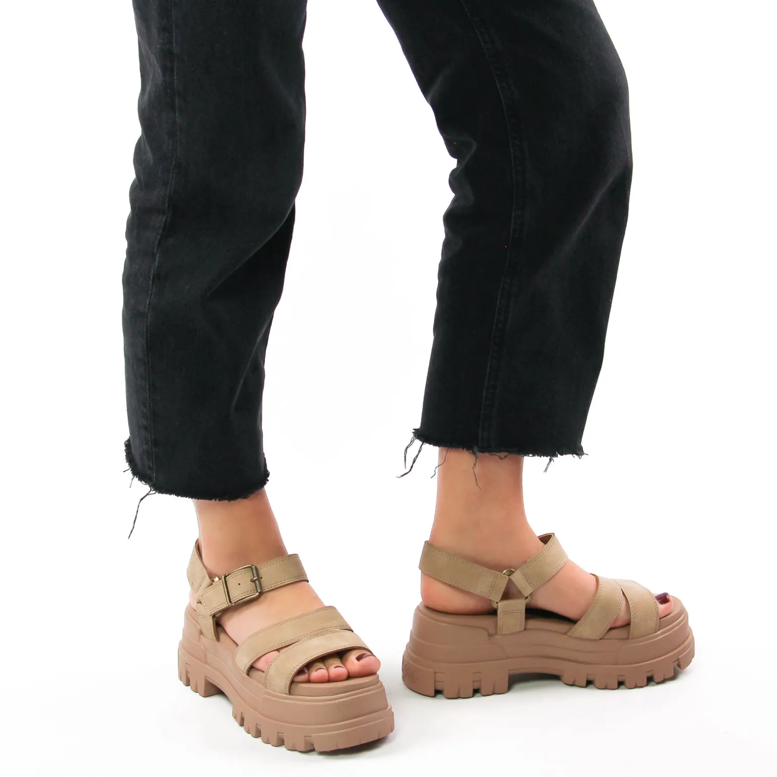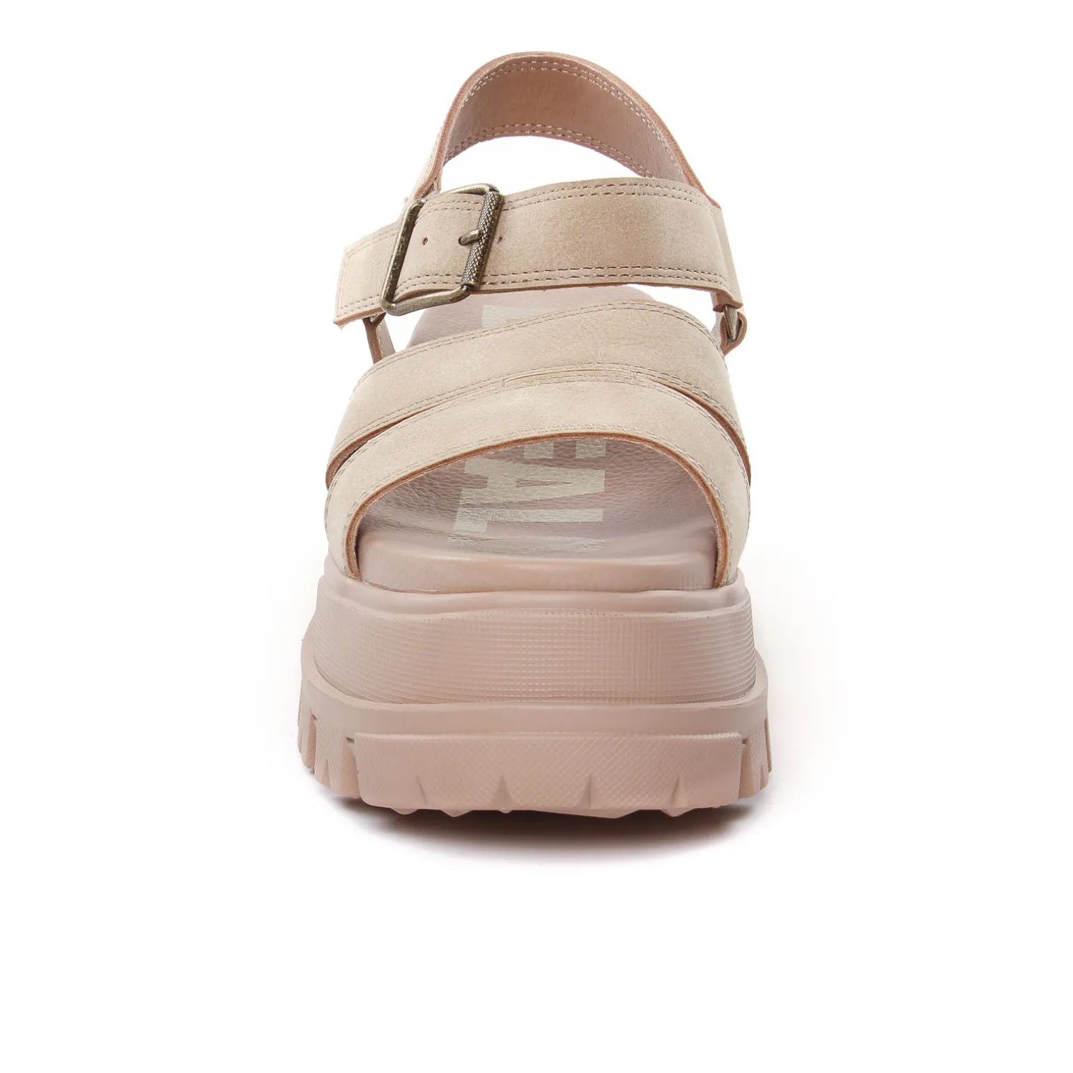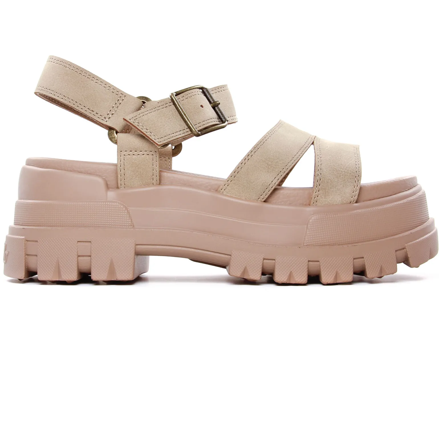 Sandales Compensées de la marque Buffalo de couleur beige taupe. Une semelle bloc très épaisse haute de presque 5 cm au talon avec crampons, bride large autour de la cheville réglable par une boucle, un simili nubuck taupe pour les brides et la claque, sandales modernes et tendances signées Buffalo.