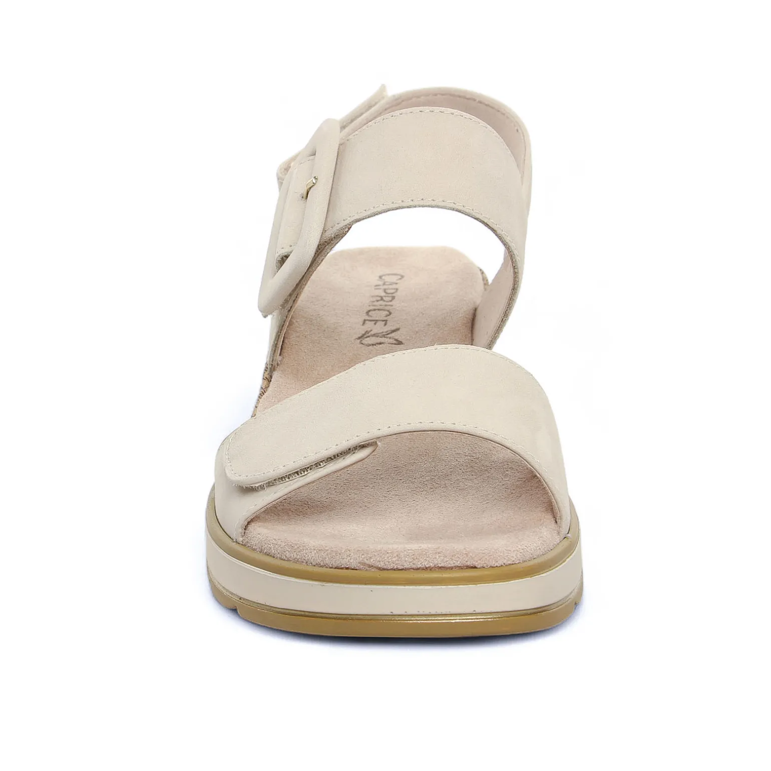 Sandales Compensées de la marque Caprice de couleur blanc beige. Nu-pieds compensés avec une tige nubuck noir ou beige taupe, trois brides réglables par velcro, une boucle décorative, une première avec amorti très confortable, sandales compensées très légères avec un grand confort de marche