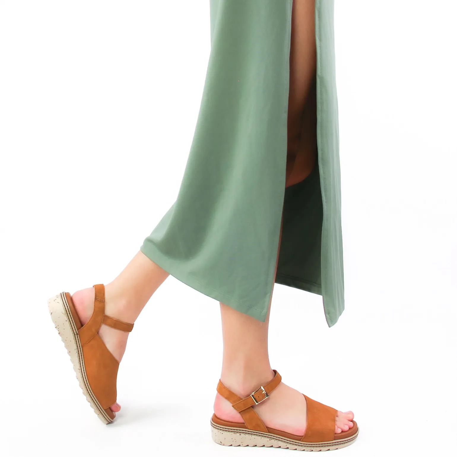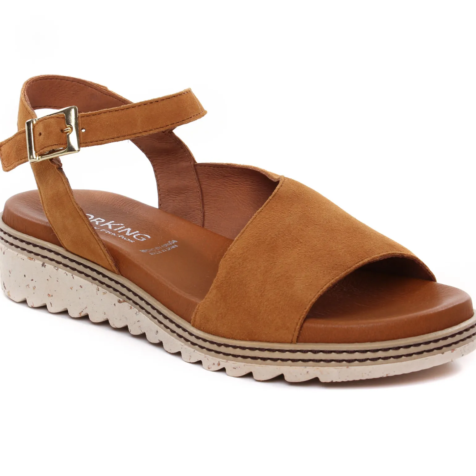 Sandales Compensées de la marque Dorking de couleur marron. Un petit talon compensé haut de 3.5 cm, tige en cuir daim marron ou vert kaki pour cette nouvelle collection été 2024, une doublure cuir, et une première cuir, une semelle sportswear confortable, sandales compensées signées Dorking by Fluchos