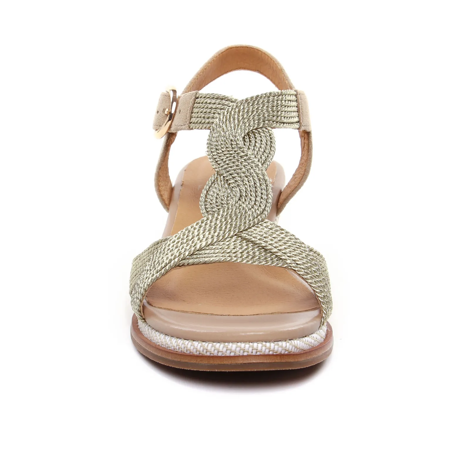 Sandales Compensées de la marque Fugitive de couleur beige doré. Jolies sandales compensées en cuir confortables, une touche glamour avec sa bride salomé dorée sur le coup de pied, un talon compensé haut de 5 cm, un patin de 1.5 cm à l’avant, sandales légères, compensées de la nouvelle collection printemps été 2024 de la marque française Fugitive
