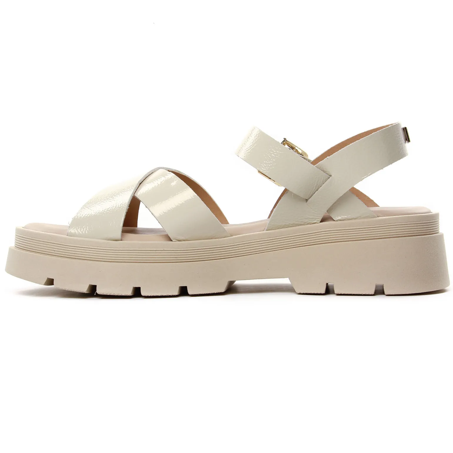Sandales Compensées de la marque Jb Martin de couleur beige. Plateforme haute de 4.5 cm au talon, une version déclinée de la JB Martin Delice, une première de propreté en cuir confortable, tige en cuir vernis, sandales de la nouvelle collection été 2023 de la marque française JB Martin.