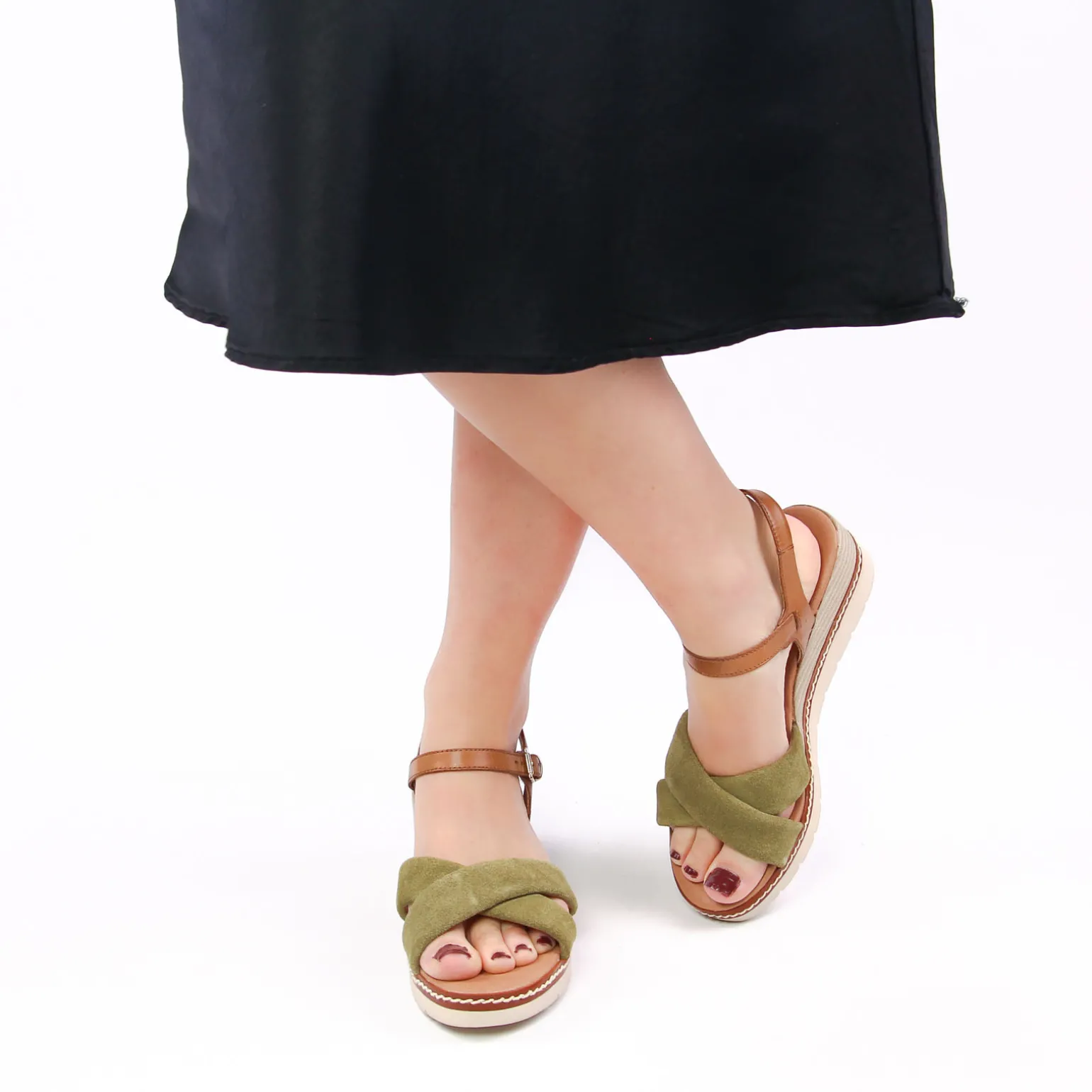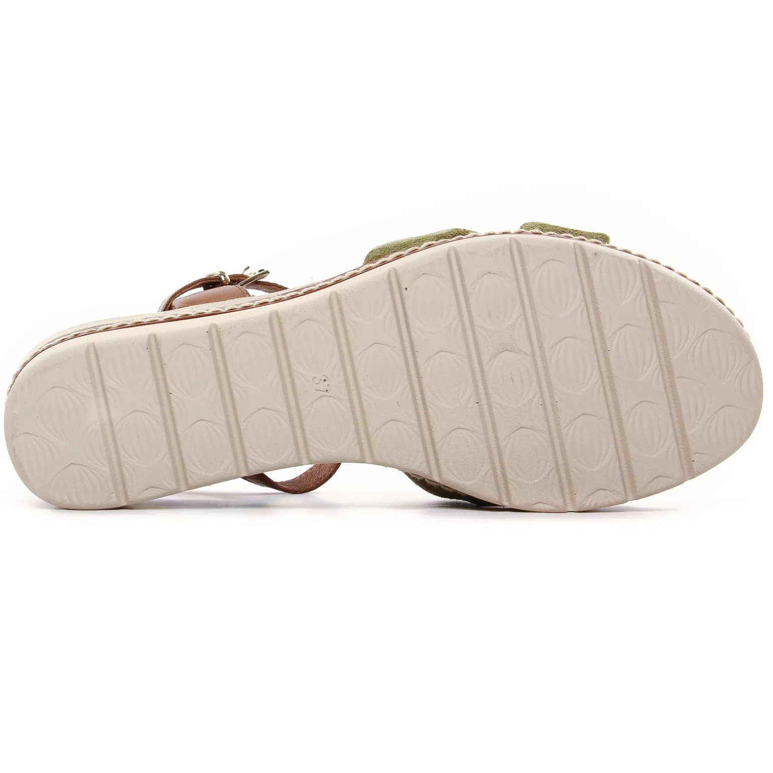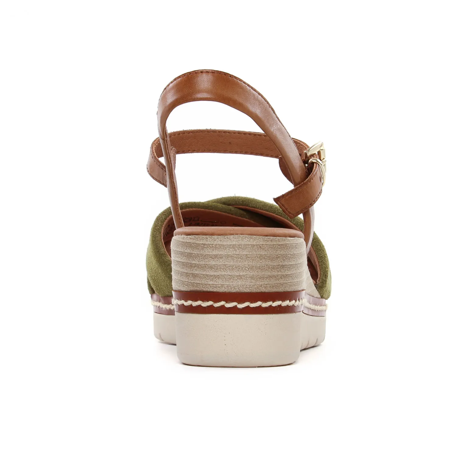 Sandales Compensées de la marque Marco Tozzi de couleur marron kaki. Nu-pieds compensés tout cuir réglable par une boucle or sur son tour de cheville, deux larges brides croisées en cuir suédé kaki ou métal or pour former la claque, une semelle blanche écru compensé haute de 5 cm au talon avec un bel effet bois avec un surpiqure cordes !