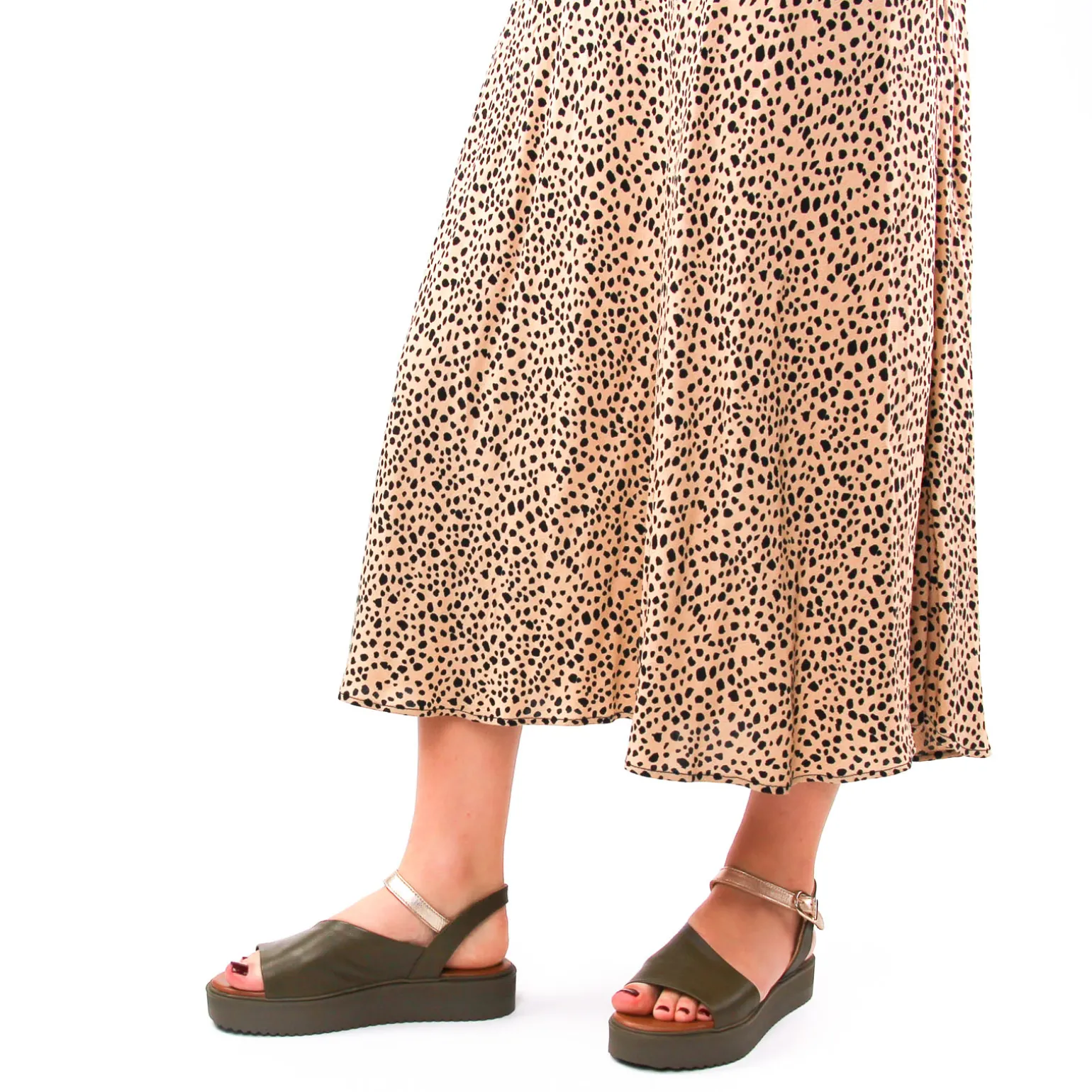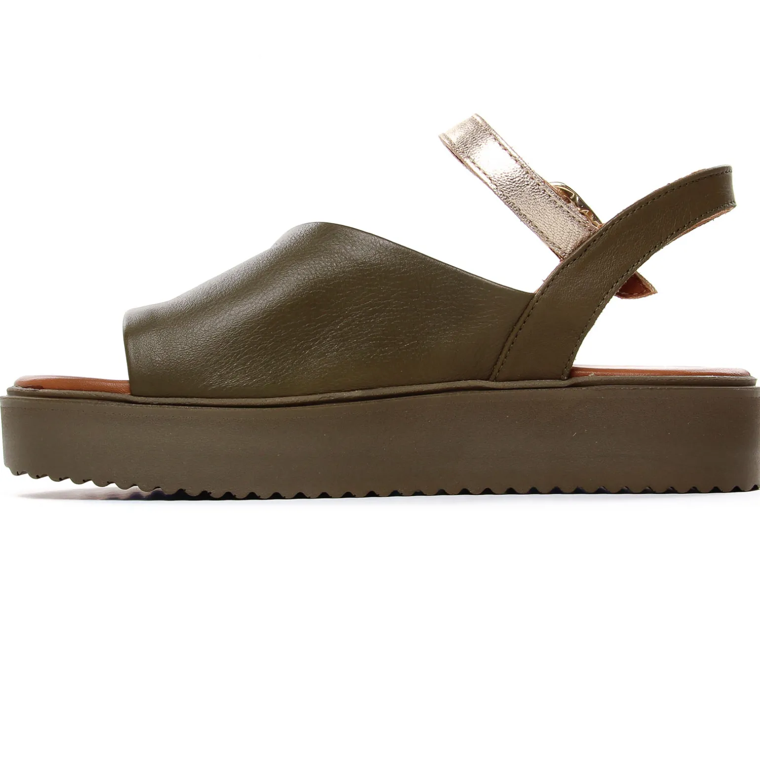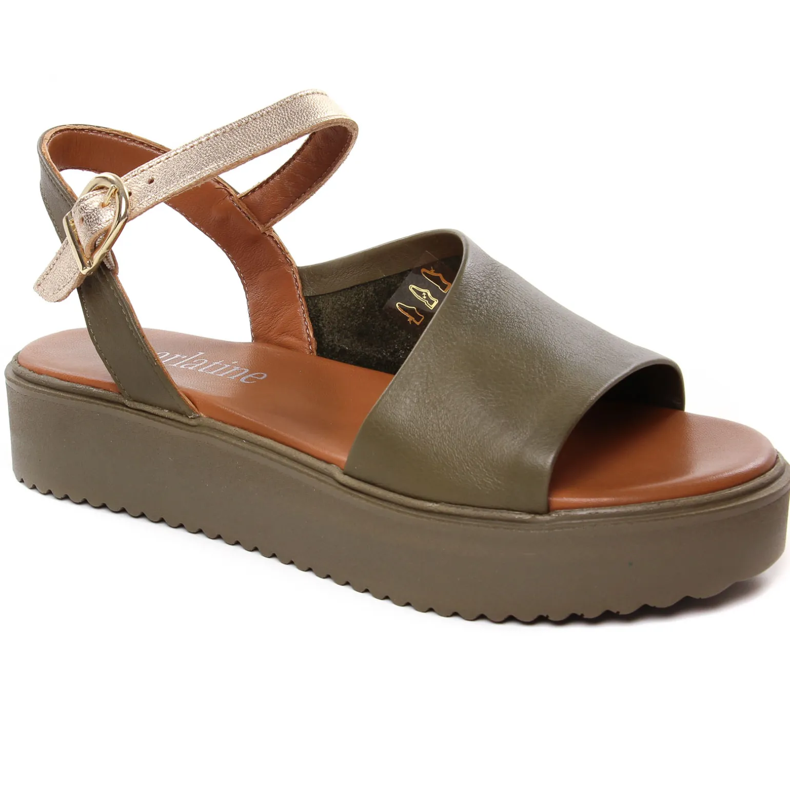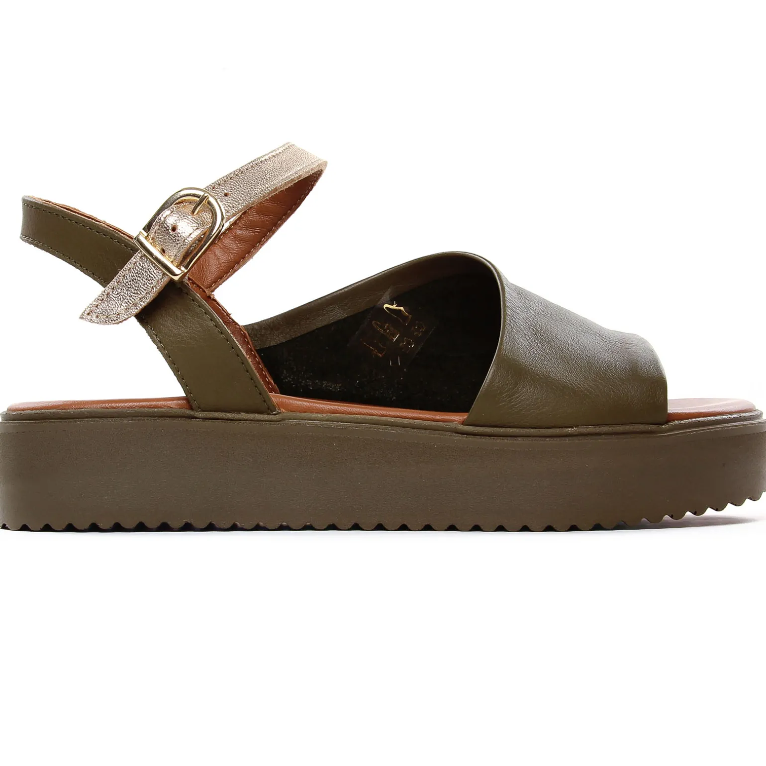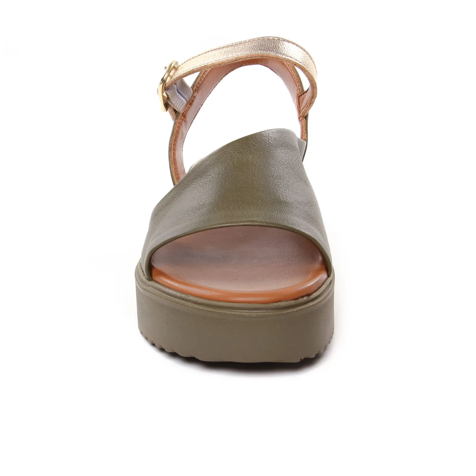 Sandales Compensées de la marque Scarlatine de couleur vert kaki. Jolies sandales plateforme élégantes et modernes avec une tige en cuir lisse noir ou en cuir métal or pour cette nouvelle collection 2024, une première cuir confortable, semelle en gomme souple haute de 4 cm au talon, sandales made in UE au Portugal