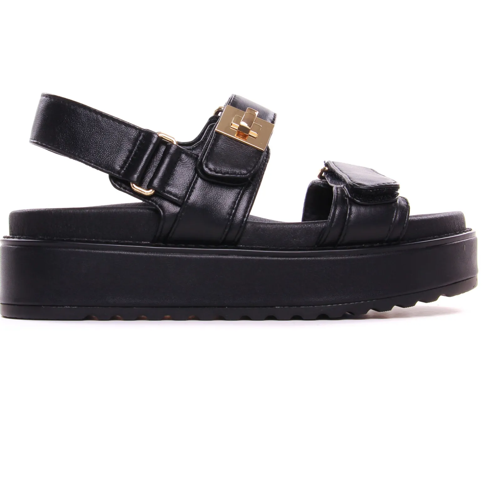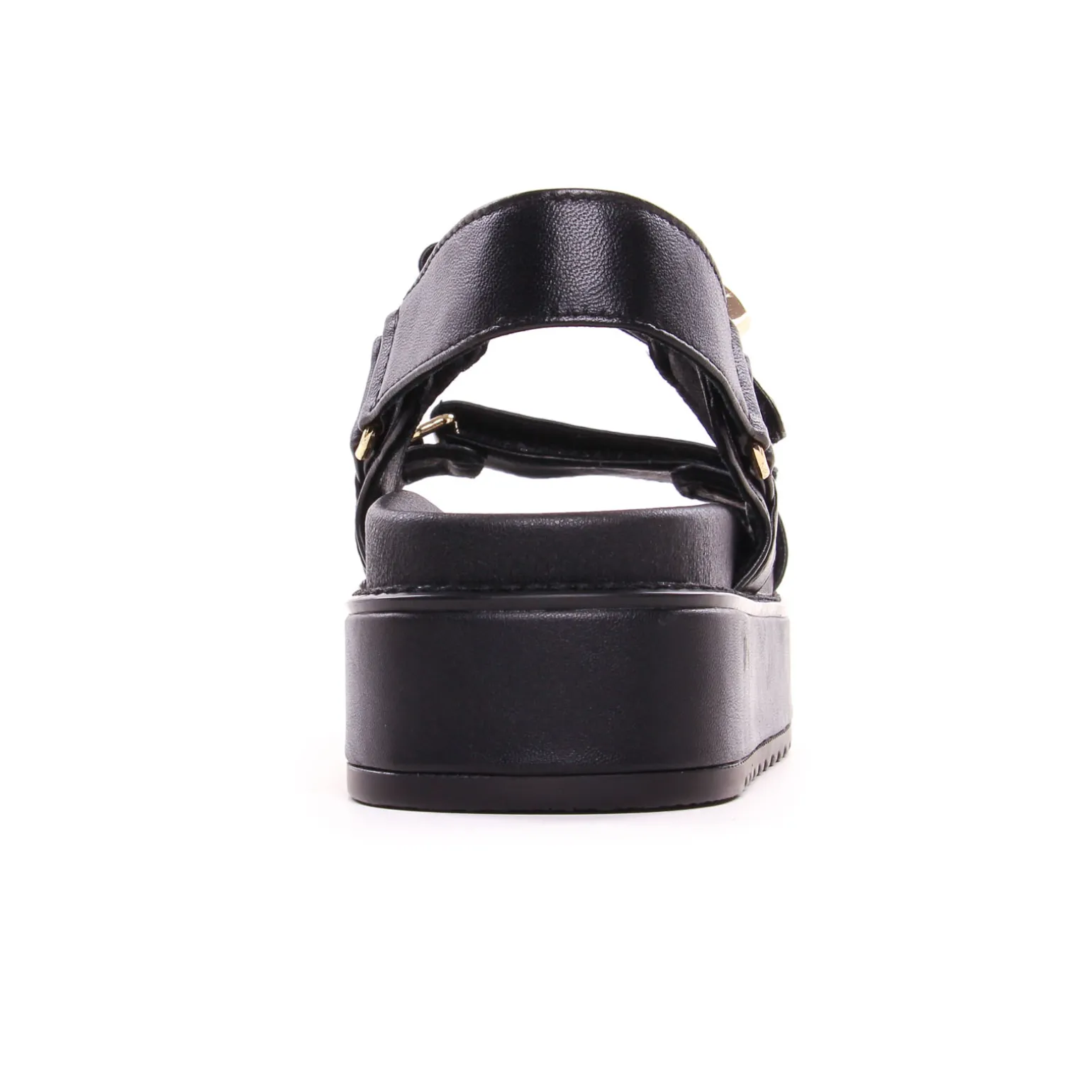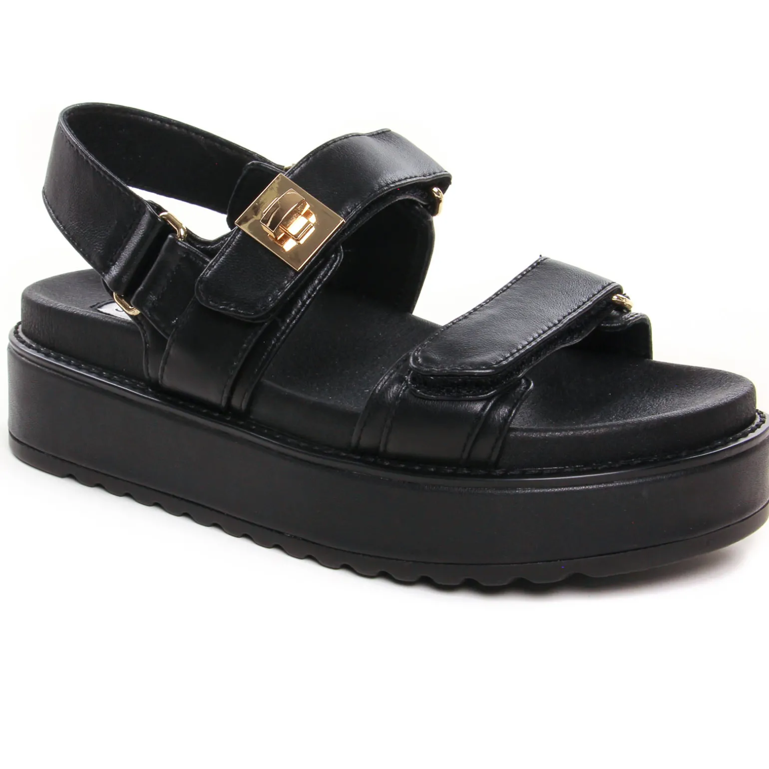 Sandales Compensées de la marque Steve Madden de couleur noir. Sandales plateformes noires, trois brides larges, sur le coup de pied un bijoux or, une assise plantaire moulée pour le confort de marche, une semelle épaisse à plateforme haute de 5 cm au talon et de 3,5 cm à l’avant