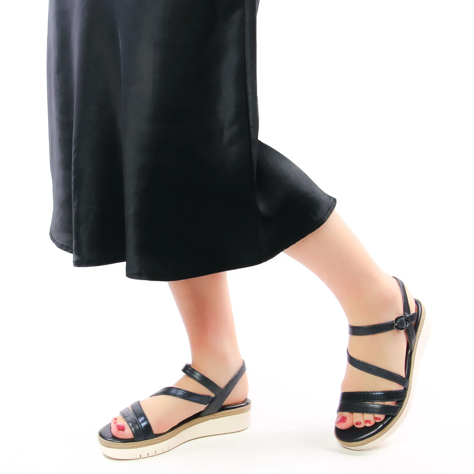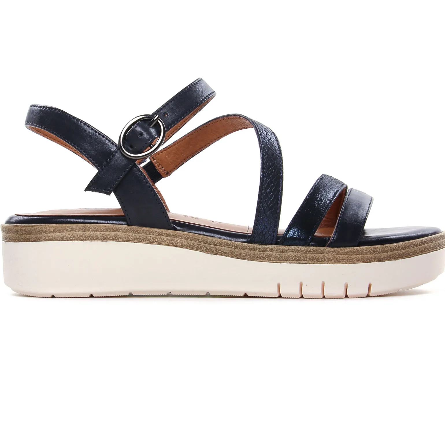 Sandales Compensées de la marque Tamaris de couleur bleu marine. Une semelle plateforme, brides en cuir disponibles dans différentes teintes, un confort de marche accru grâce à sa première Touch it en cuir, plateforme haute de 6.5 cm au talon, fermeture à scratch discrète et très pratique !