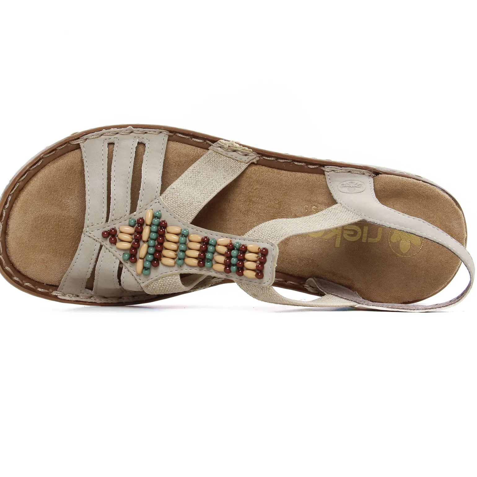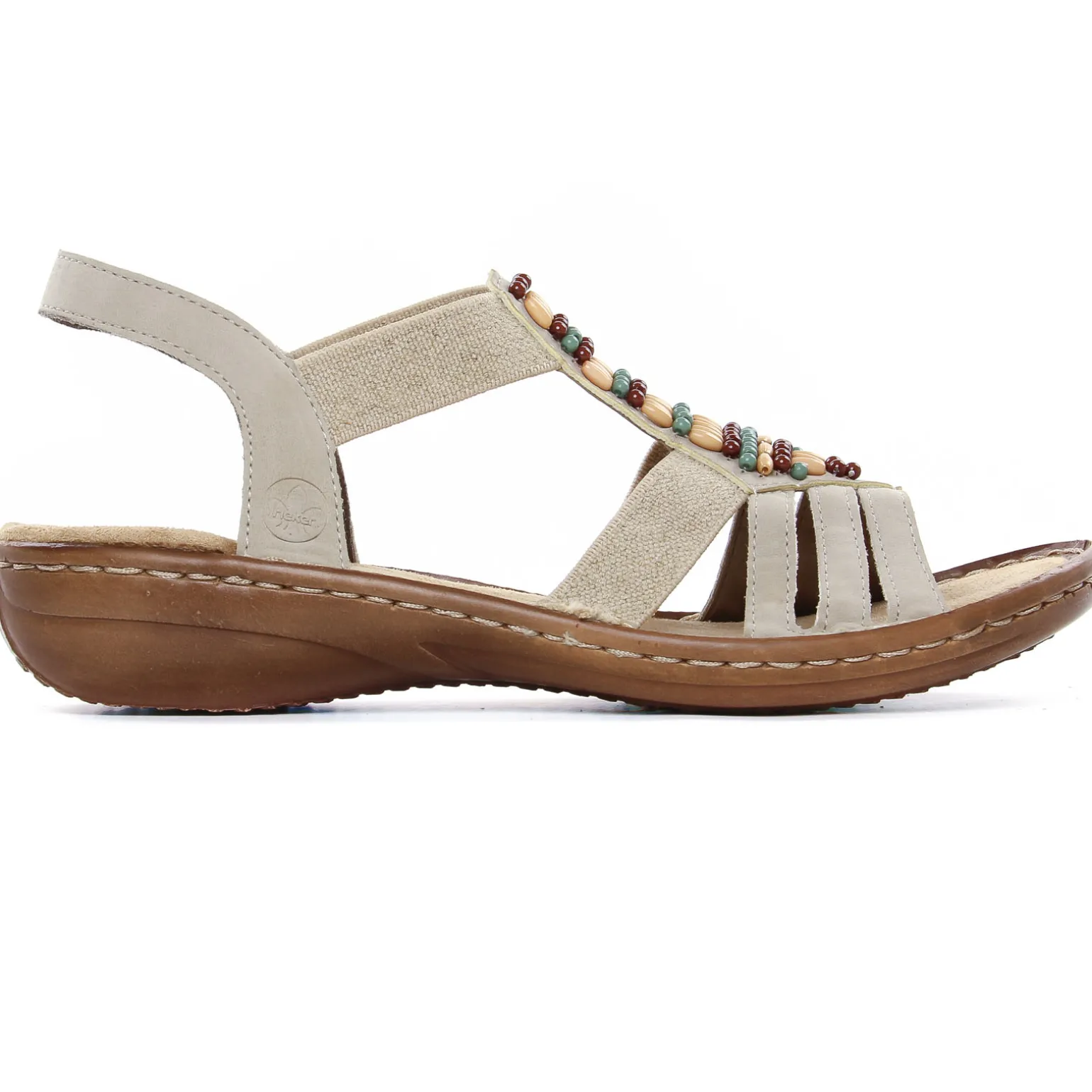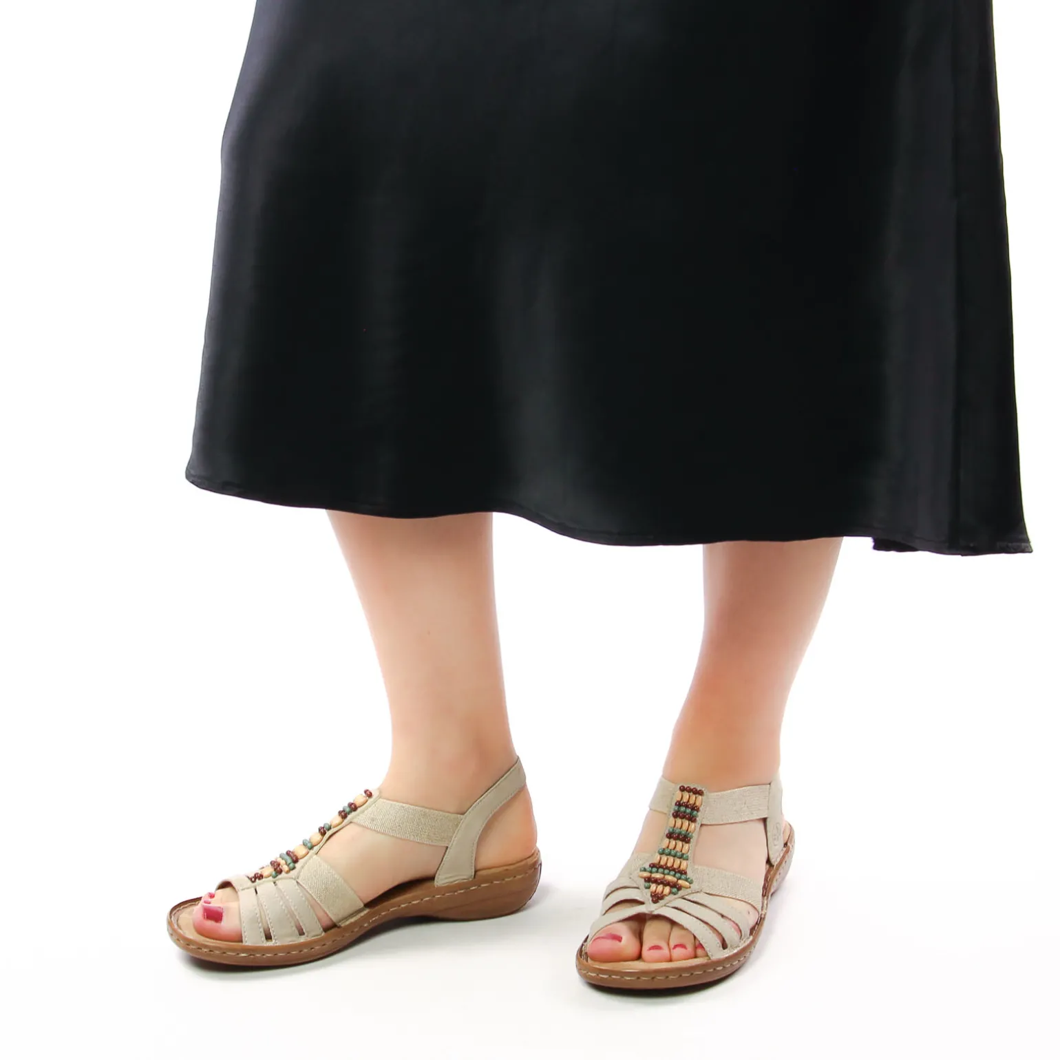Sandales de la marque Rieker de couleur beige. Sandales confort avec des brides élastiquées, une construction Salomé avec un bijou sur le coup de pied pour une touche bohème chic à votre style, une première douce en textile velours très confortable, une semelle souple tendre amortissant