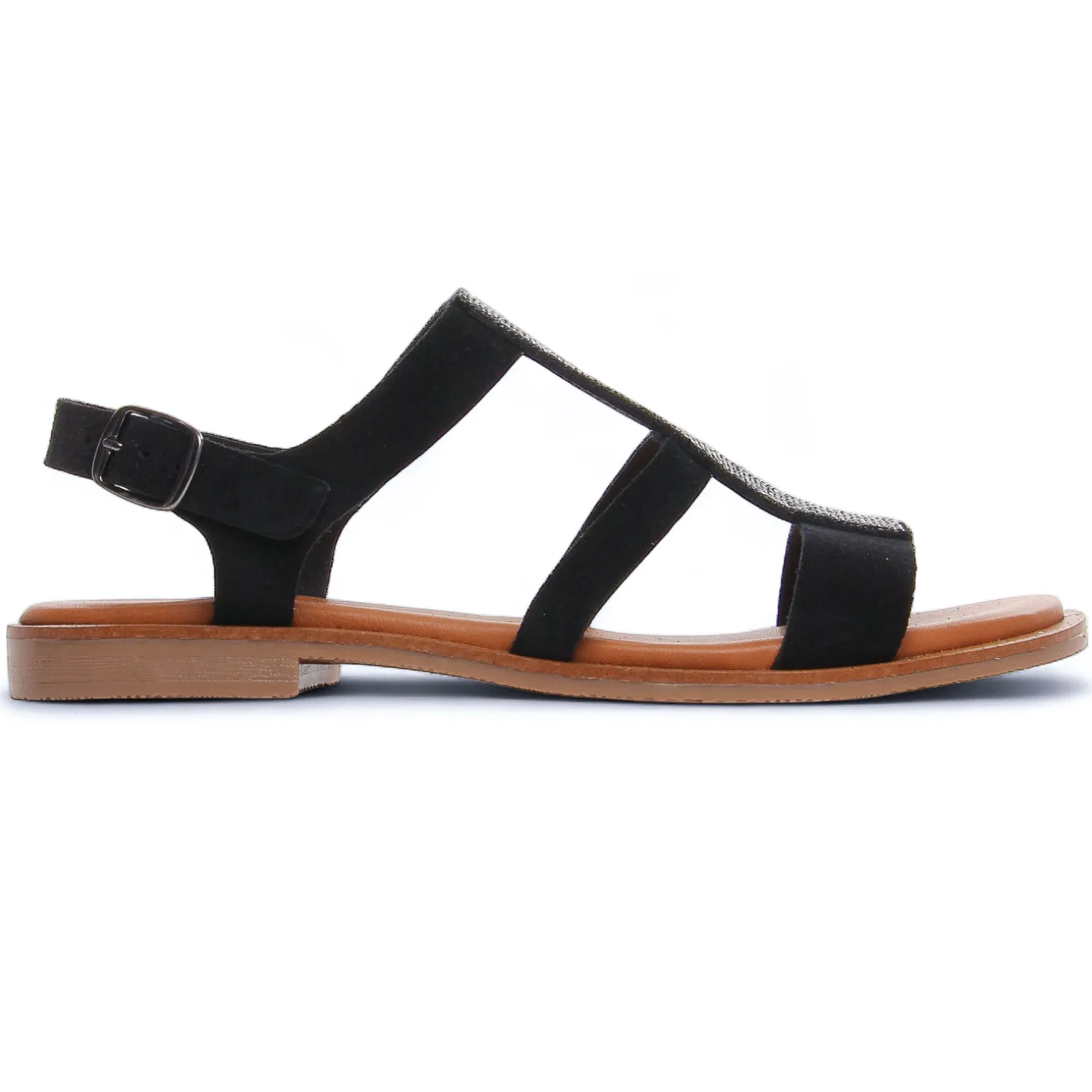 Sandales de la marque Scarlatine de couleur noir. Sandales plates très légères avec une tige en cuir nubuck noir et bride Salomé ornée de paillettes, sandales élégantes et confortables avec une bride réglable par boucle et une première cuir amortissante, sandales made in UE