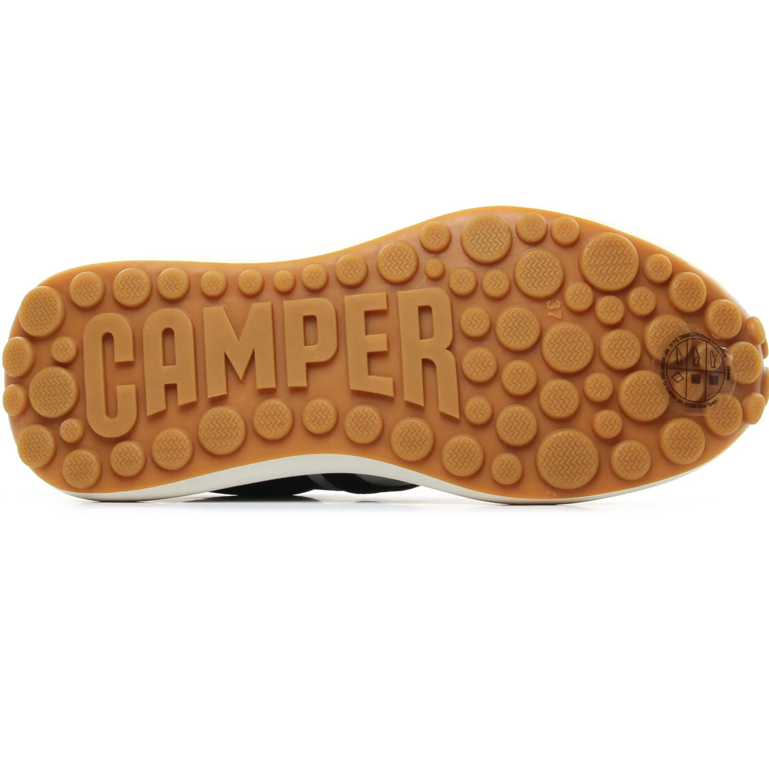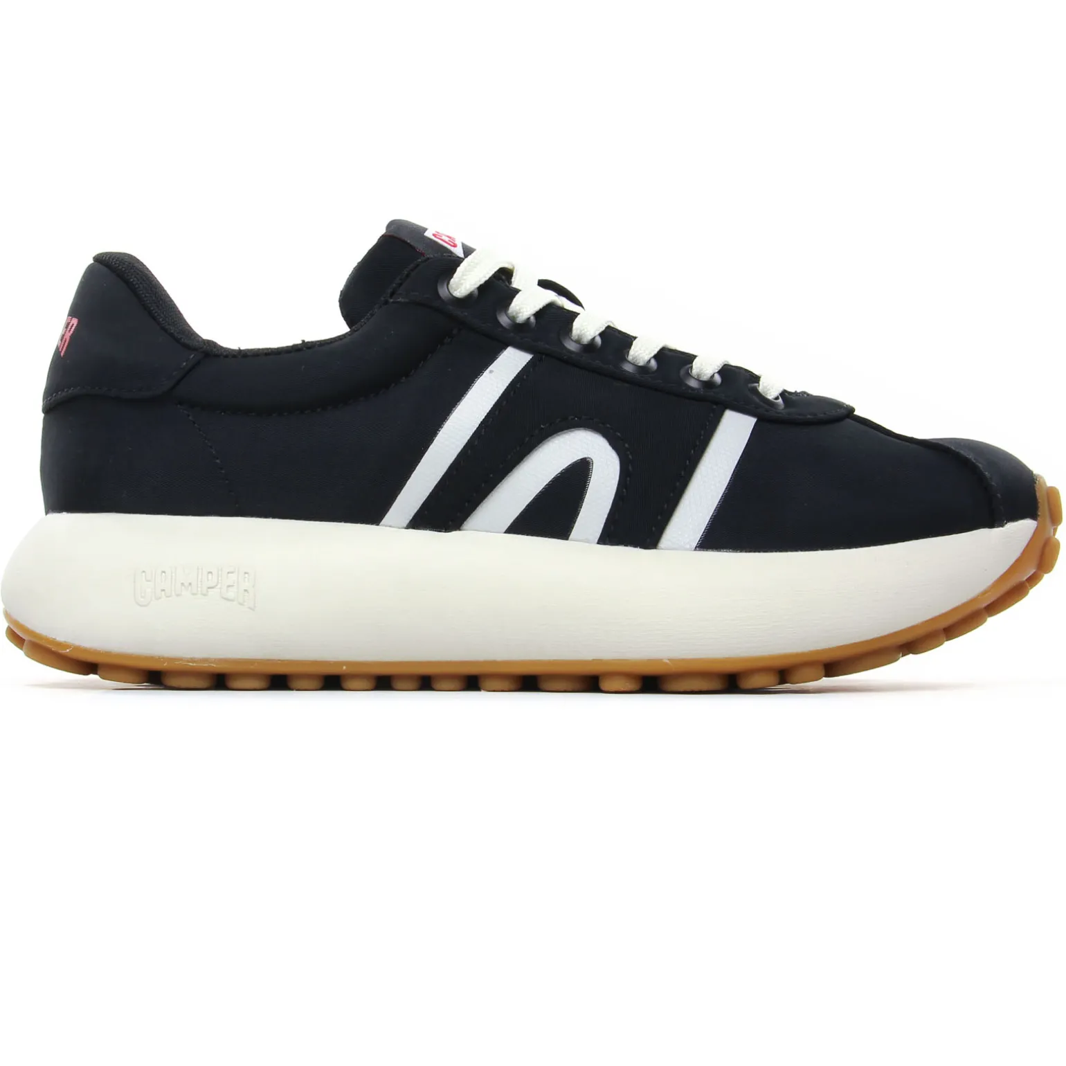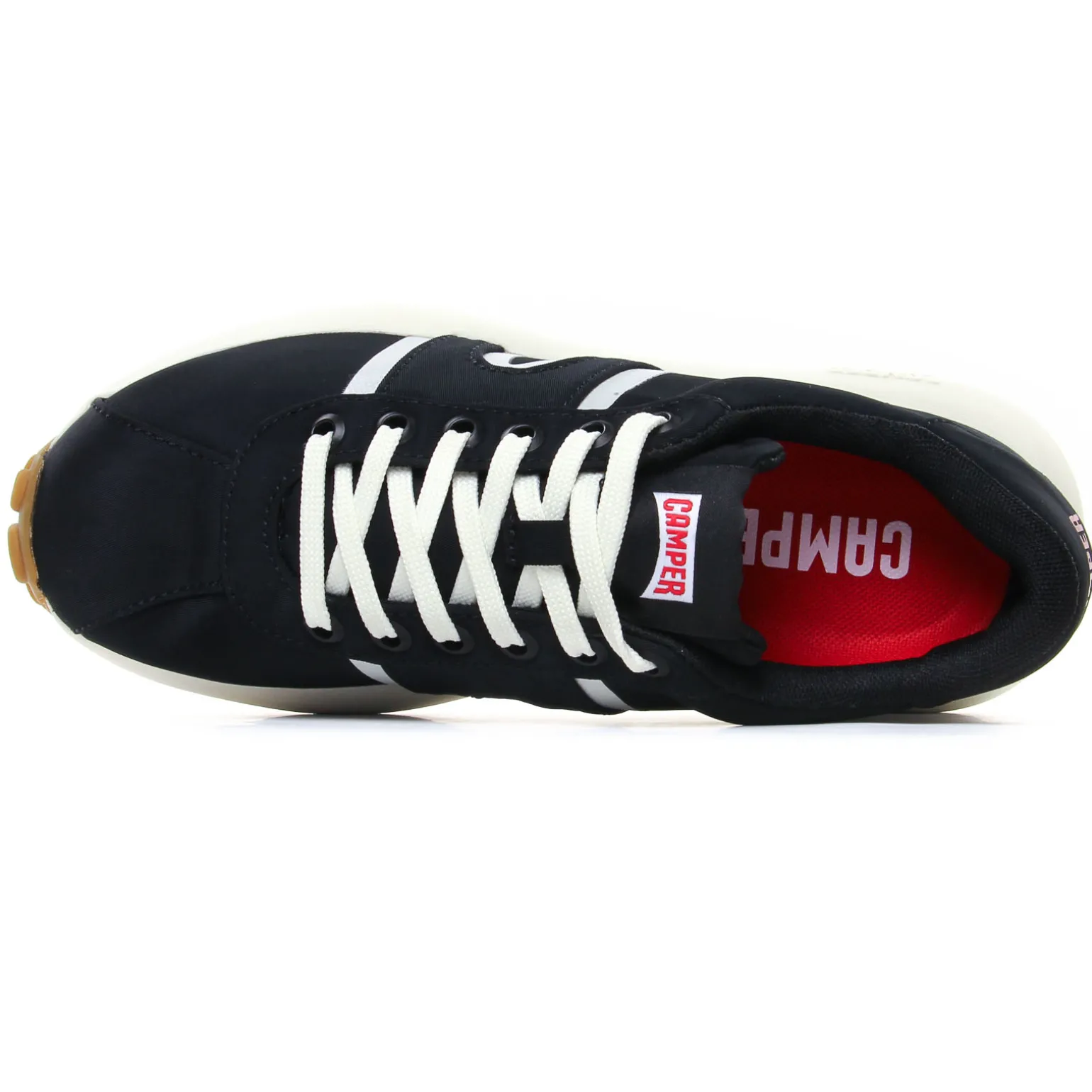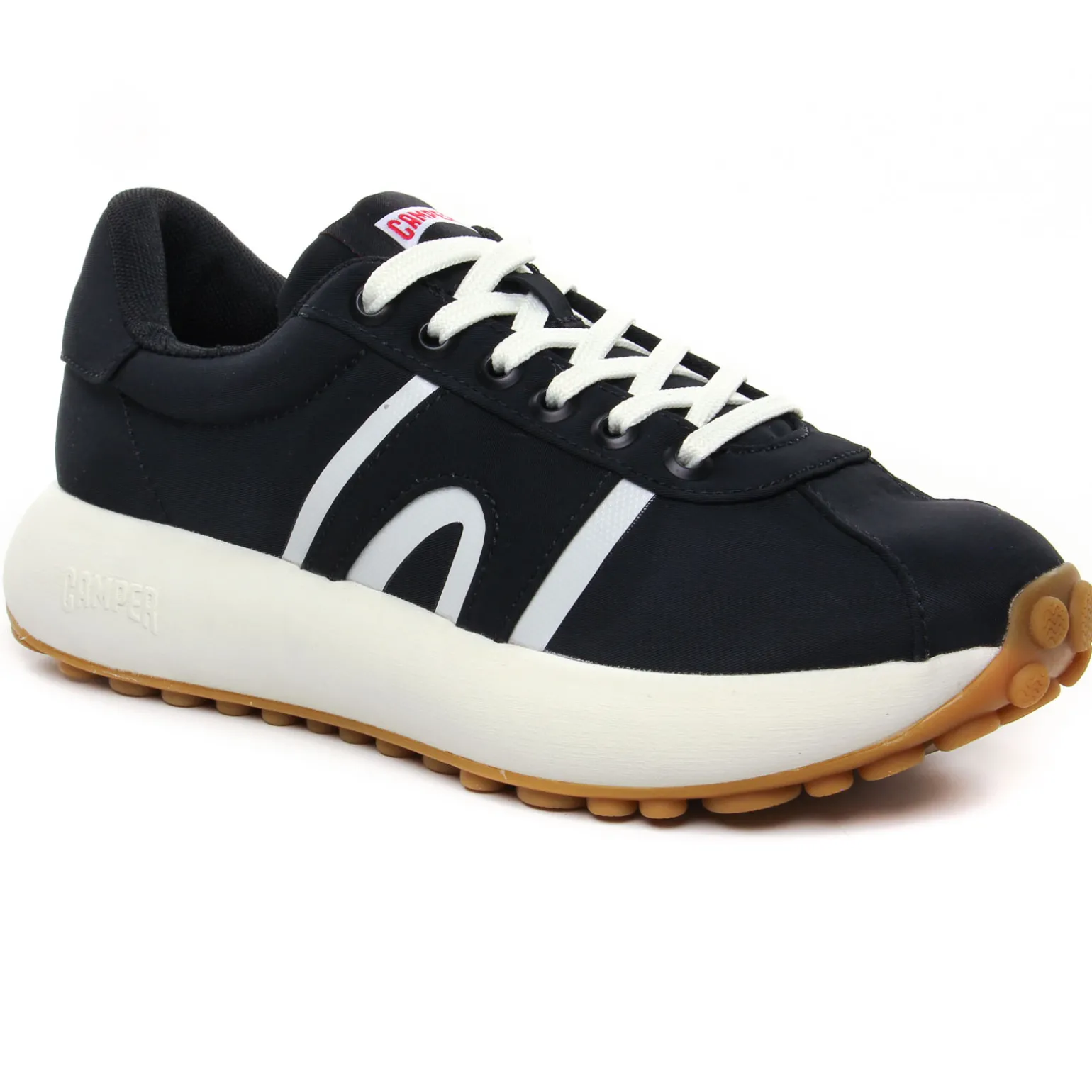Tennis de la marque Camper de couleur noir. Sneakers femme en textile recyclé, une technologie sans coutures, première de propreté OrthoLite elle aussi en matières recyclées, une semelle blanche en caoutchouc EVA, baskets basses tendances nommées Athens, un nom inspiré de l’origine du sport dans la Grèce antique