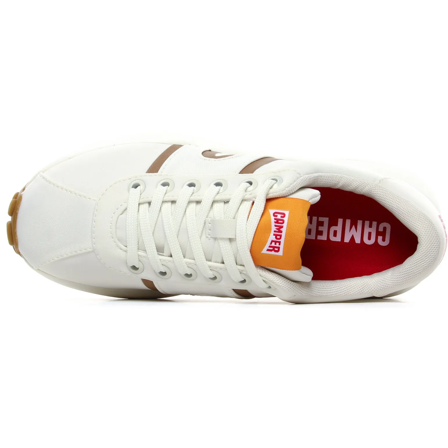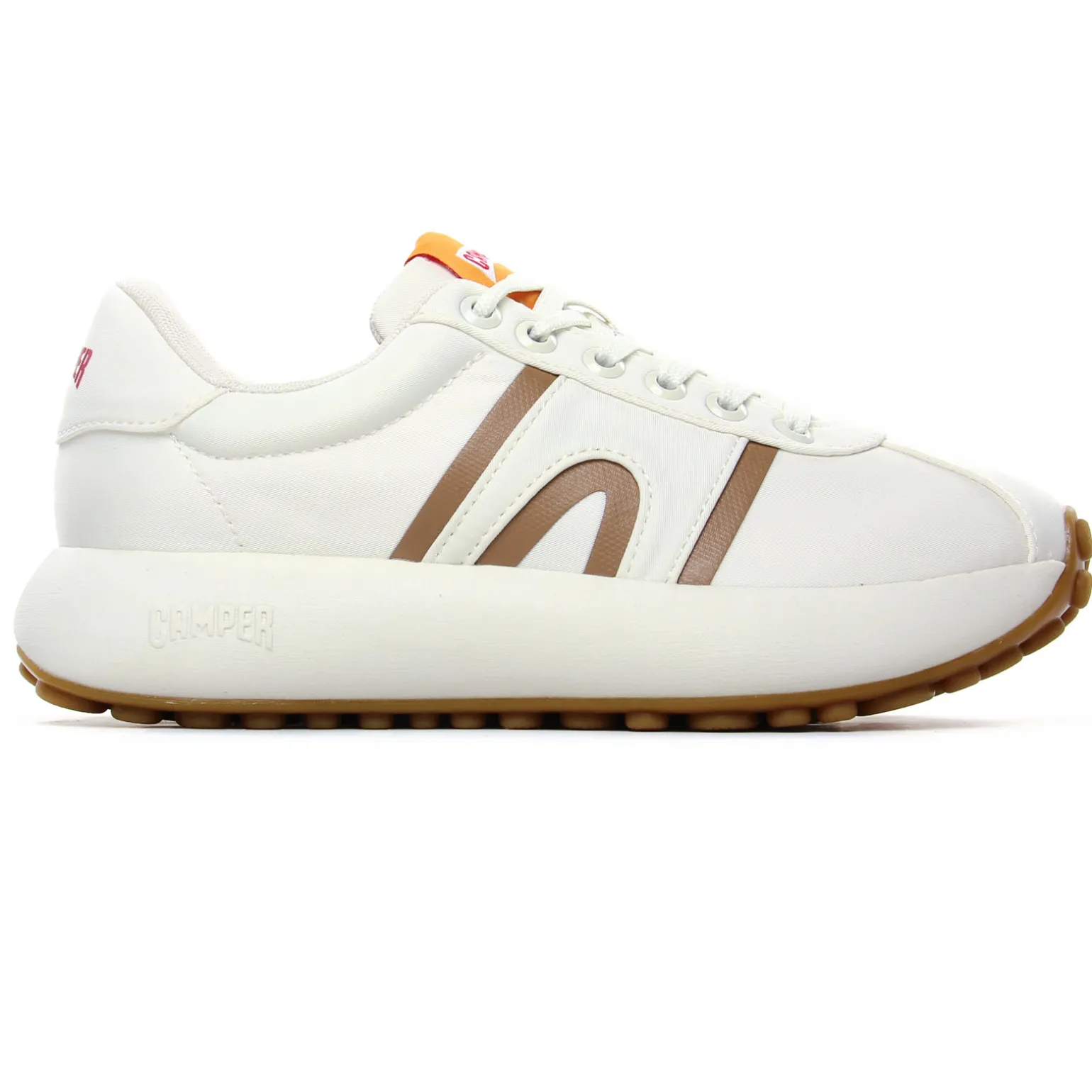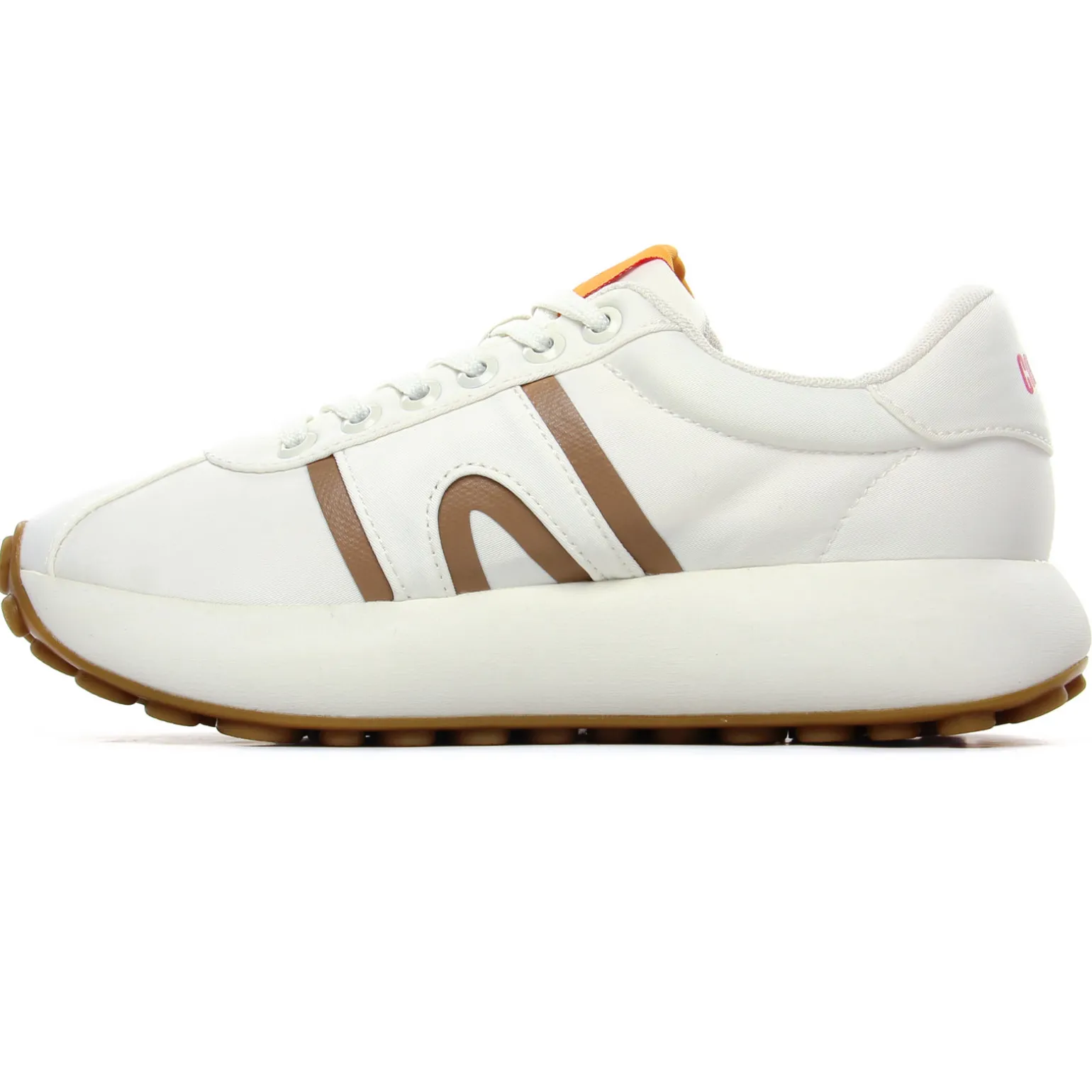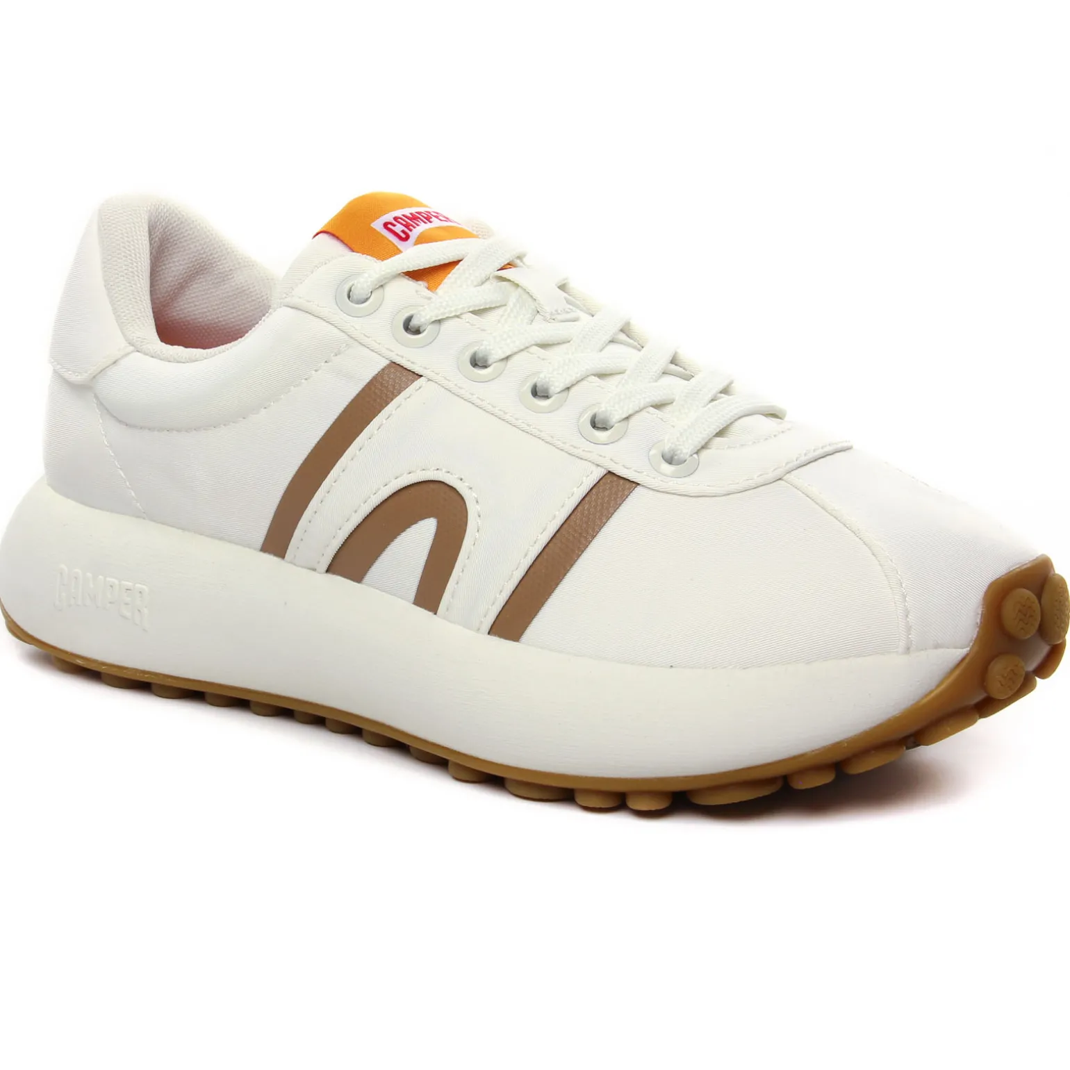 Tennis de la marque Camper de couleur blanc. Sneakers femme en textile recyclé, une technologie sans coutures, première de propreté OrthoLite elle aussi en matières recyclées, une semelle blanche en caoutchouc EVA, baskets basses tendances nommées Athens, un nom inspiré de l’origine du sport dans la Grèce antique