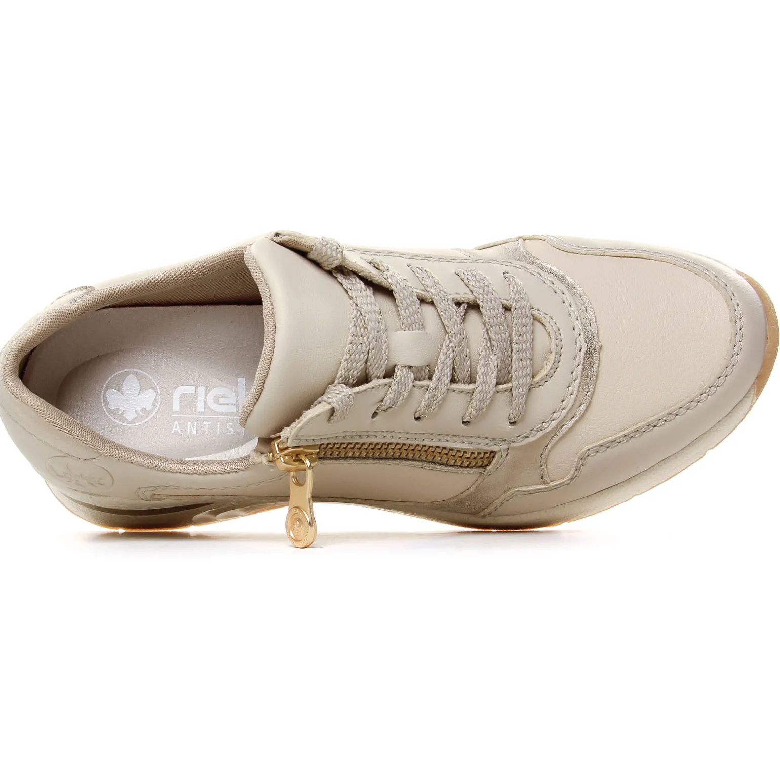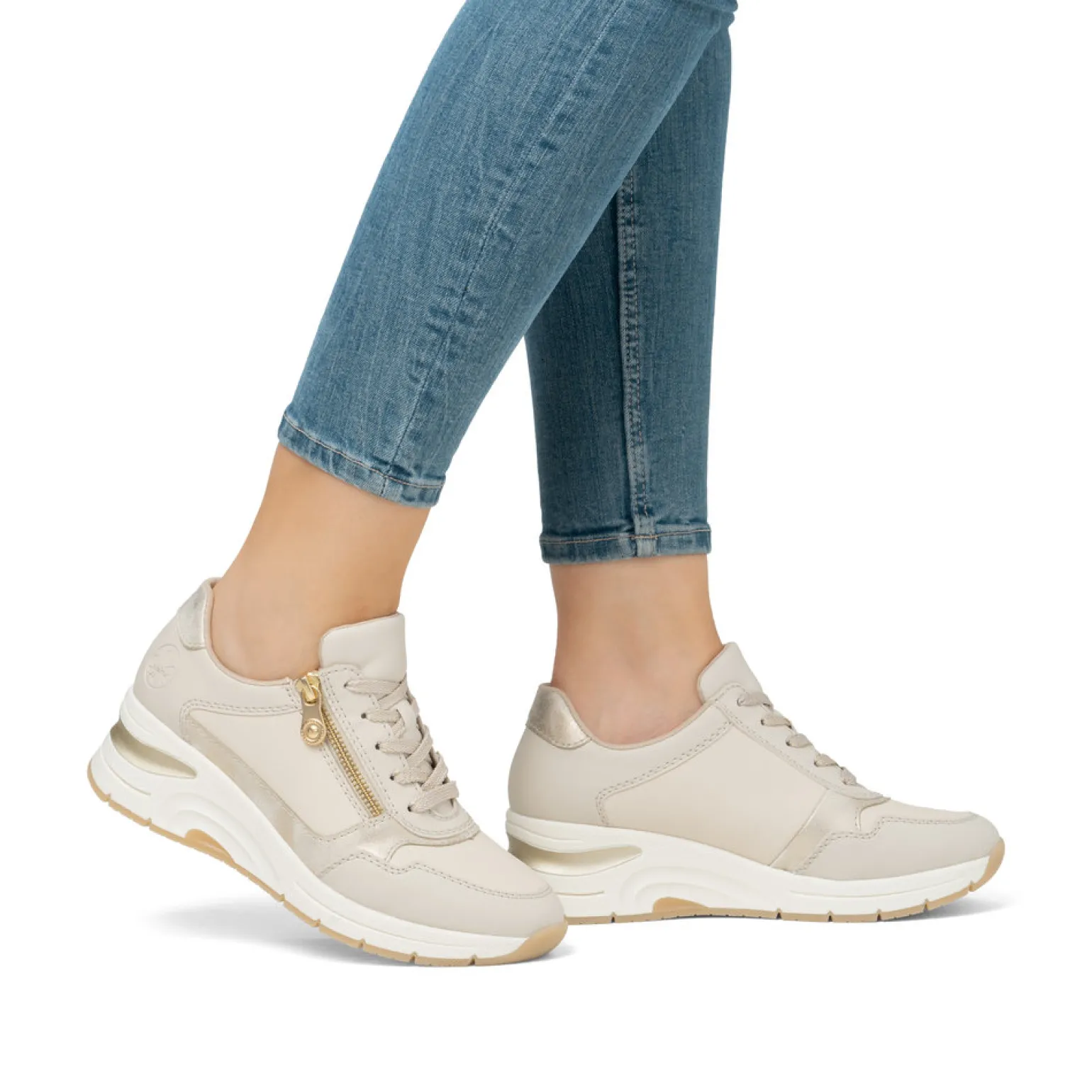Tennis Et Baskets Mode de la marque Rieker de couleur beige or. Jolies baskets compensées, élégantes pour une tenue décontracte et confort, une première FOAM à mémoire de forme et amovible si besoin, tige en cuir lisse noir, zippée pratique pour les chausser rapidement, baskets Rieker déclinées dans une version beige doré pour cette nouvelle collection printemps 2025