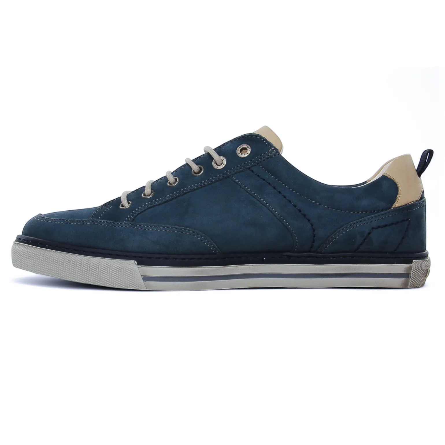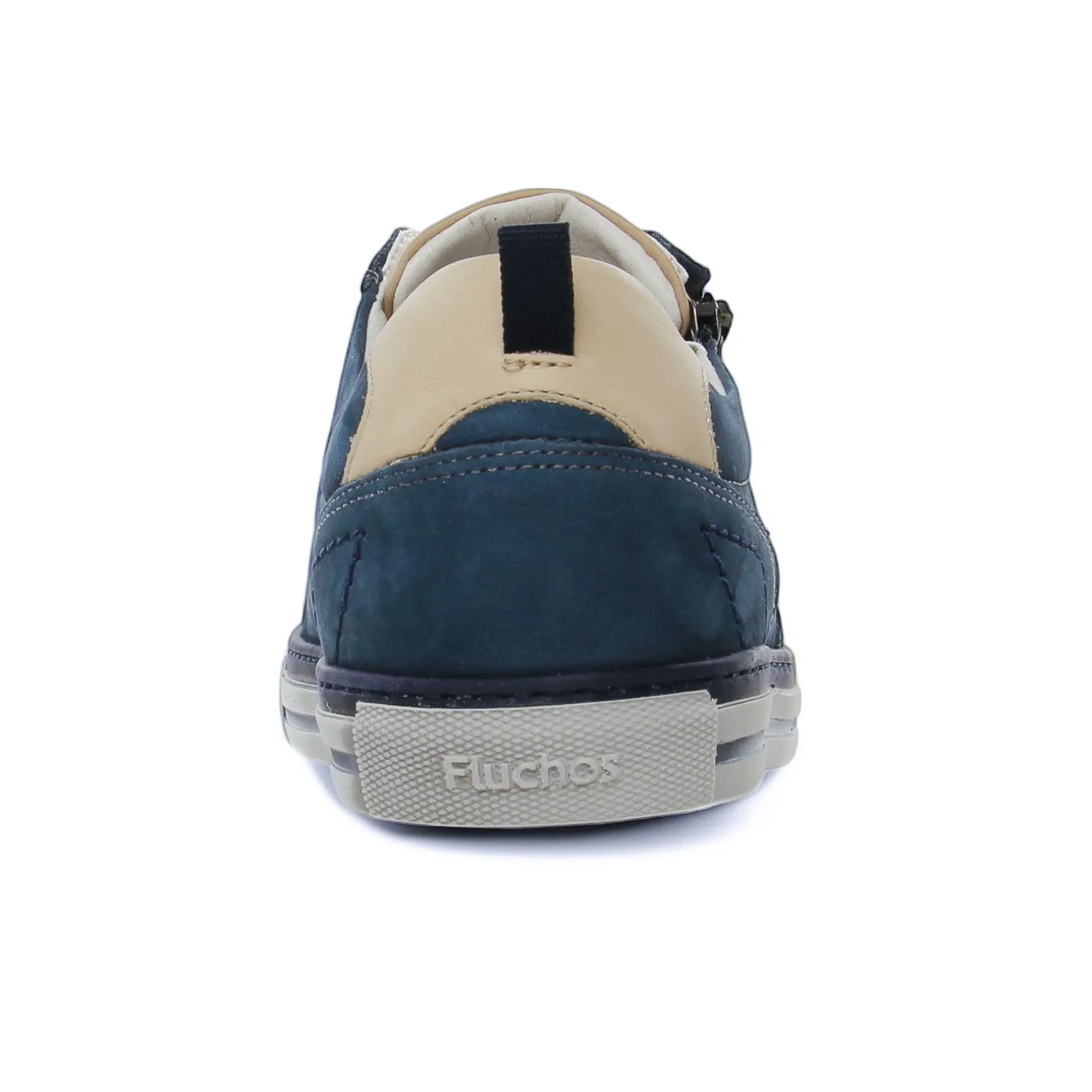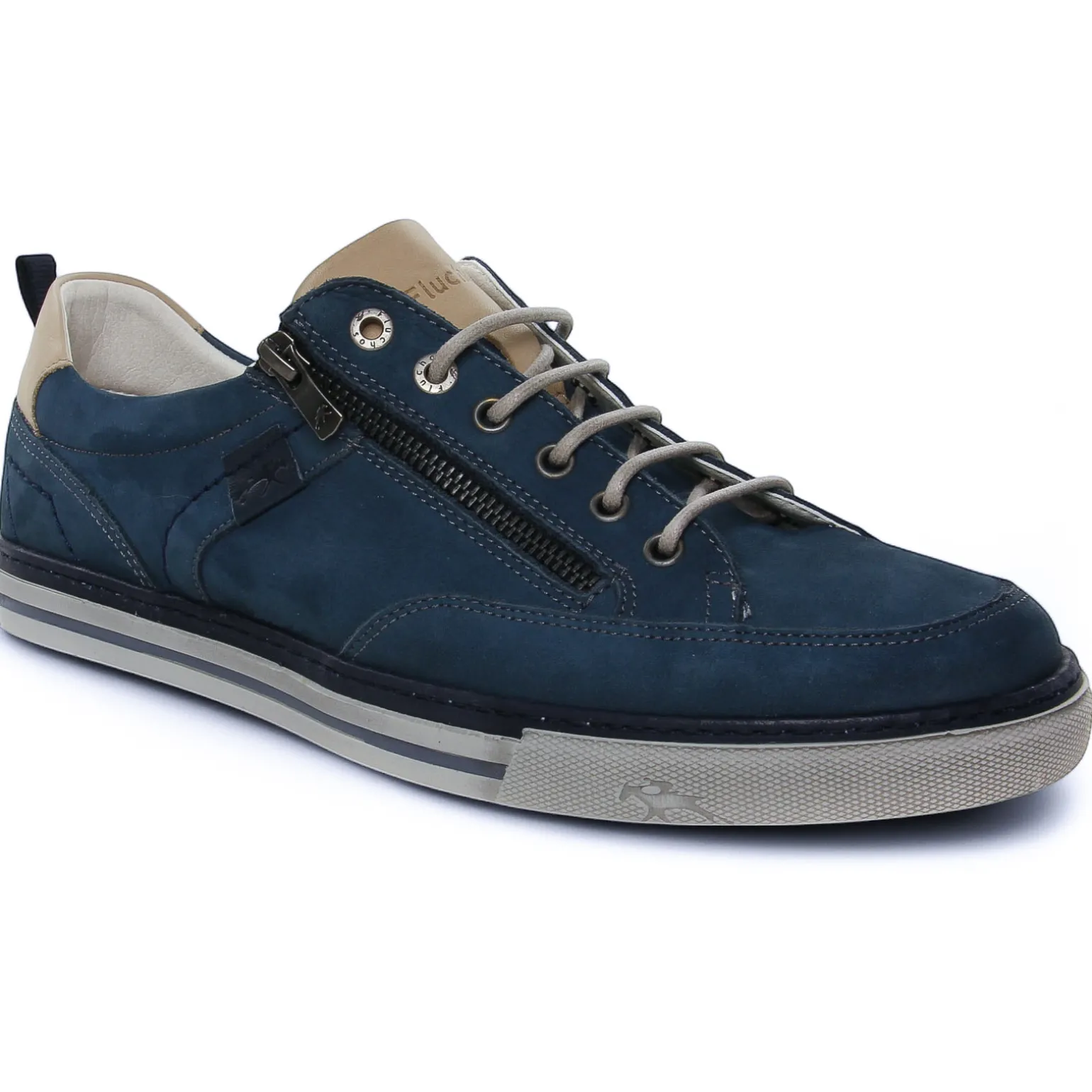 Tennis de la marque Fluchos de couleur bleu marine. Chaussure sport de ville confortable et moderne par sa couleur marine délavée, tige en nubuck avec zip et lacets ronds en coton gris clair, languette bi-colore bleu et beige, empiècement au talon beige, première ergonomique et respirante, semelle grise et insert bleu, une première amovible !