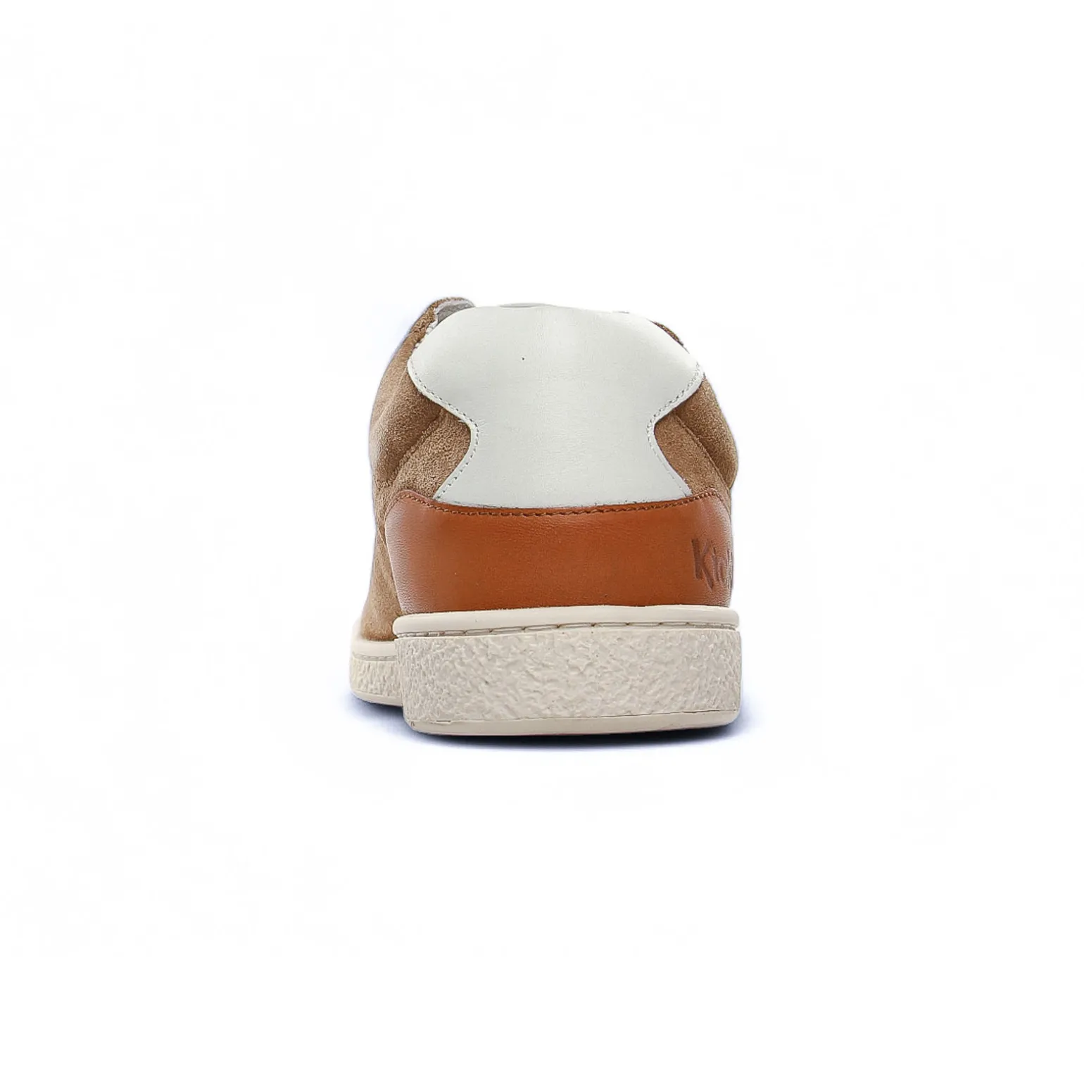 Tennis de la marque Kickers de couleur camel beige. Tennis en cuir suédé de couleur camel, une première amovible en cuir confortable, une semelle blanche en gomme souple, une doublure textile, nouvelle collection Kickers homme été 2025