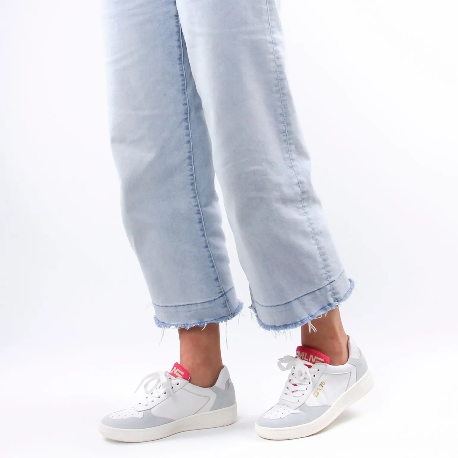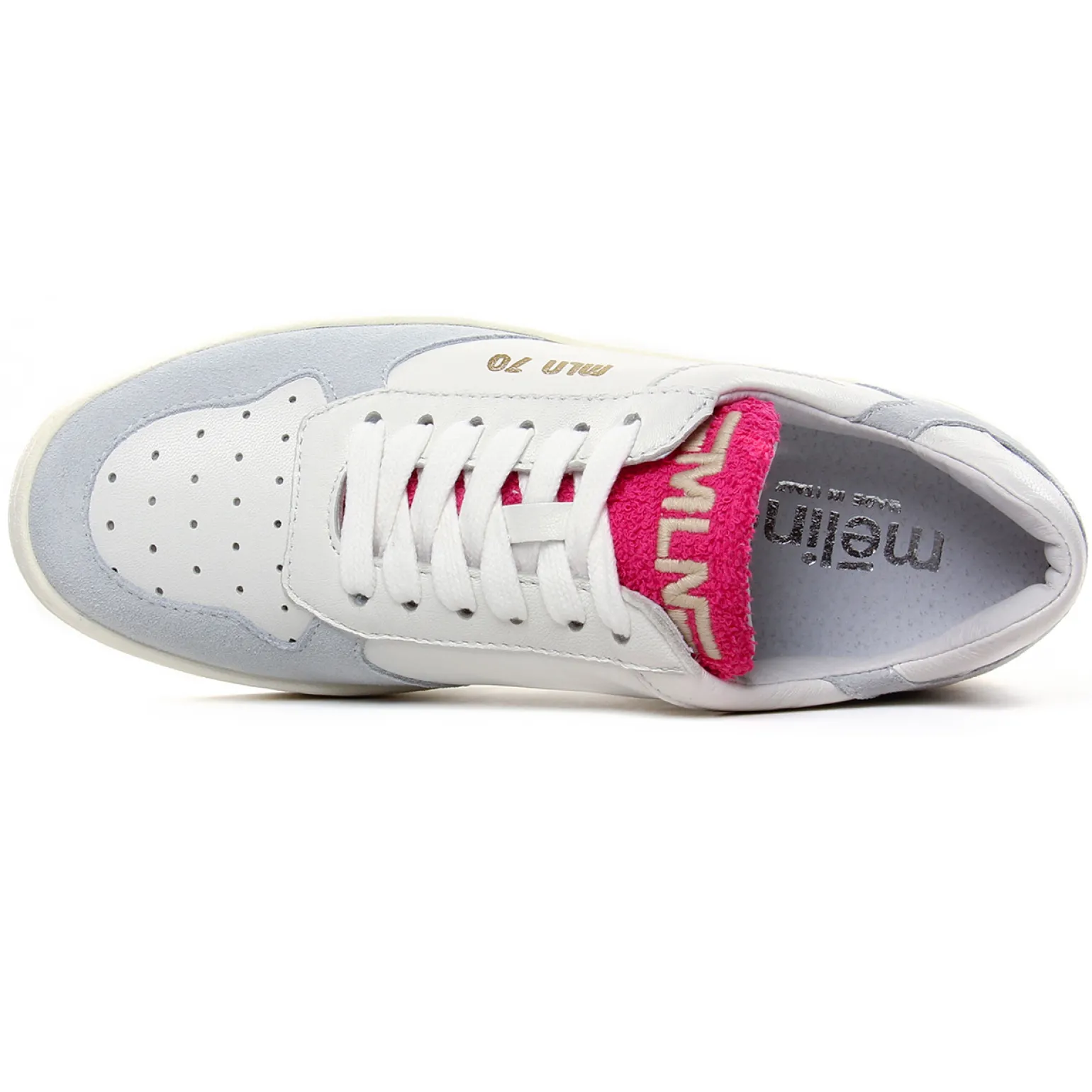 Tennis de la marque Méliné de couleur blanc rose. Tennis tendances avec une tige en cuir, mélange de cuir lisse et de cuir suédé, une languette en textile fourure rose fushia pour une touche originale et tendance, tennis de la nouvelle collection de la célèbre marque Méliné, une première cuir et une doublure textile, une semelle blanche en gomme.