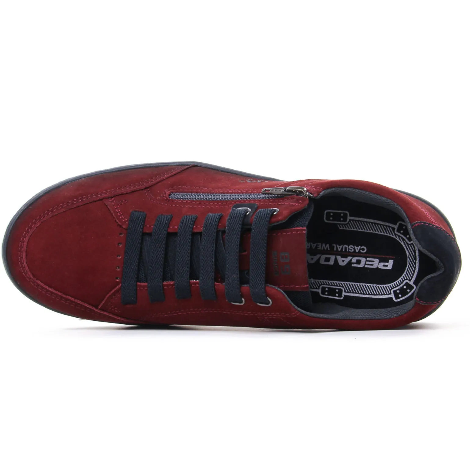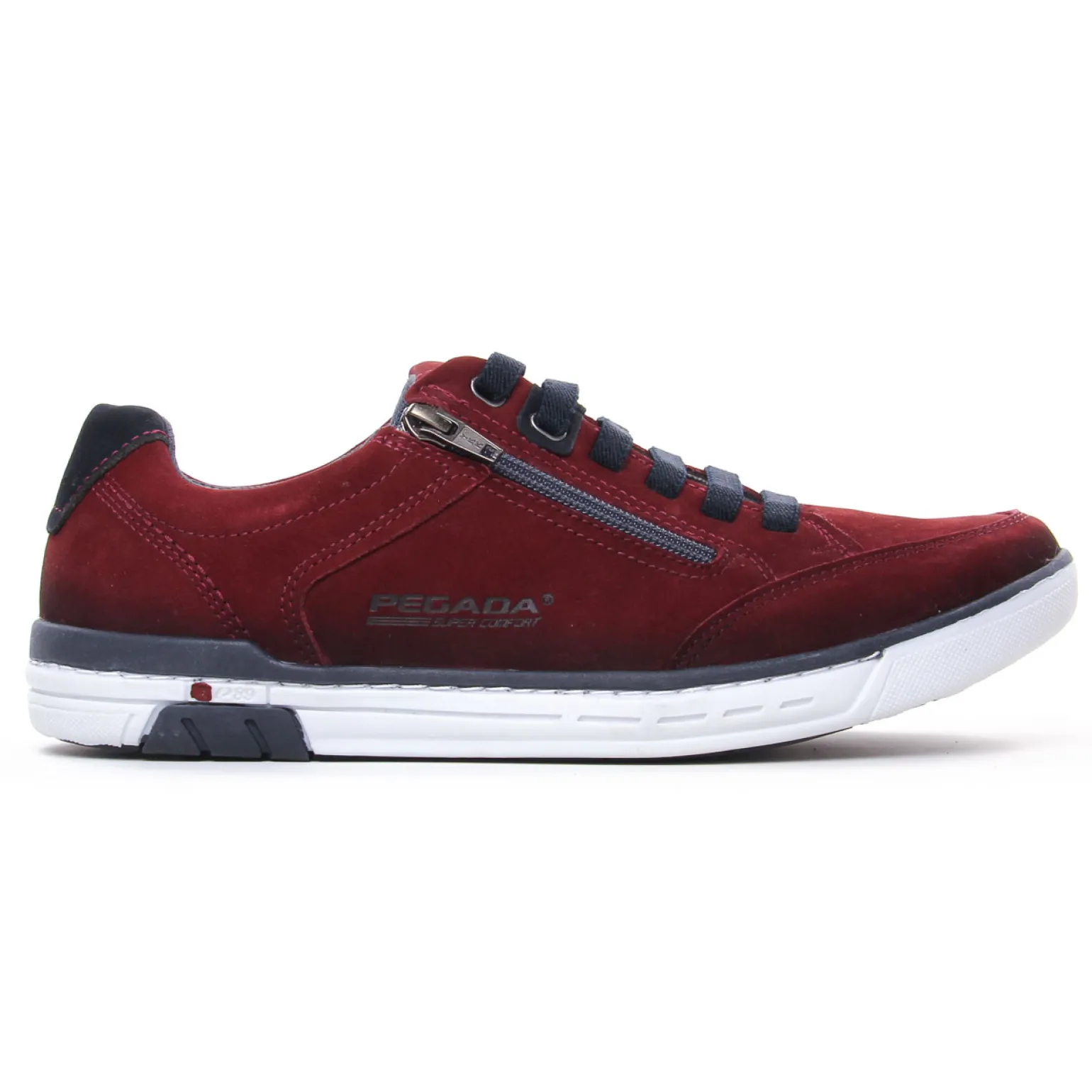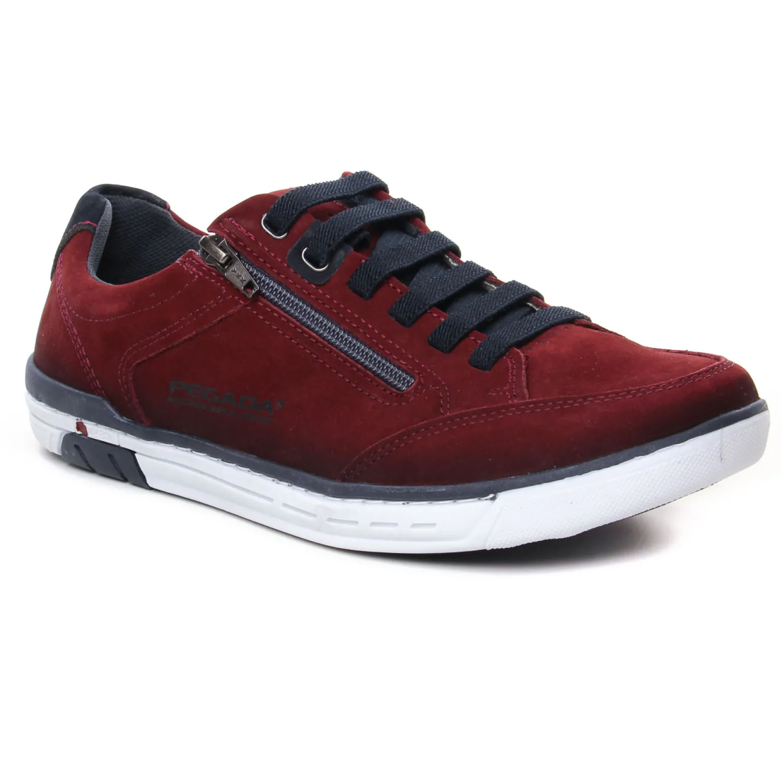 Tennis de la marque Pegada de couleur bordeaux. Belles tennis en cuir suédé confortables, parfaites pour une tenue élégante et décontractée, tennis disponibles en rouge carmin, doublure textile, semelle blanche souple, nouvelle collection Pegada Automne 2022