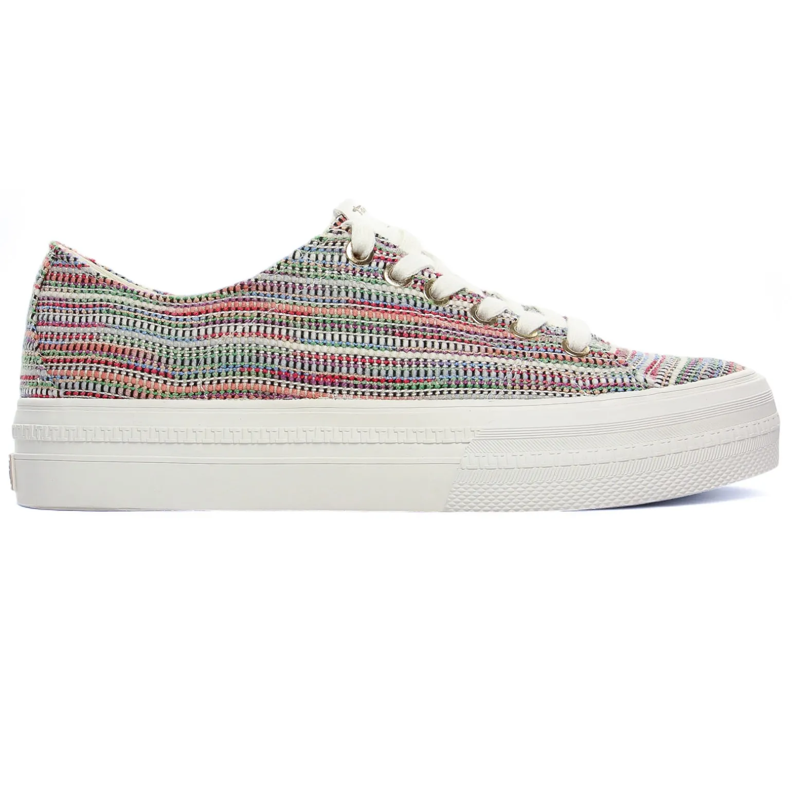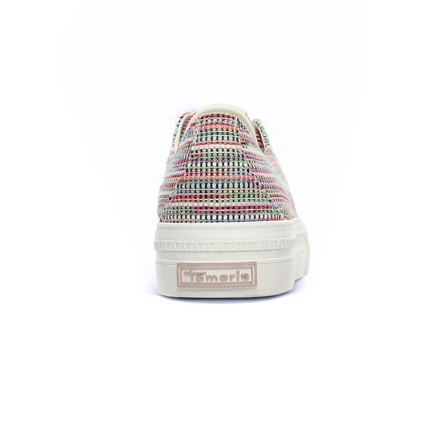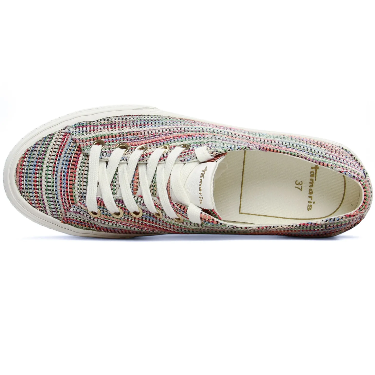 Tennis Plateforme de la marque Tamaris de couleur multicolore. Sneakers toile disponibles avec un motif léopard, en blanc immaculé ou en toile multicolore, une semelle plateforme blanche de 3,5 cm de hauteur au talon, une première textile avec amorti, des lacets blancs