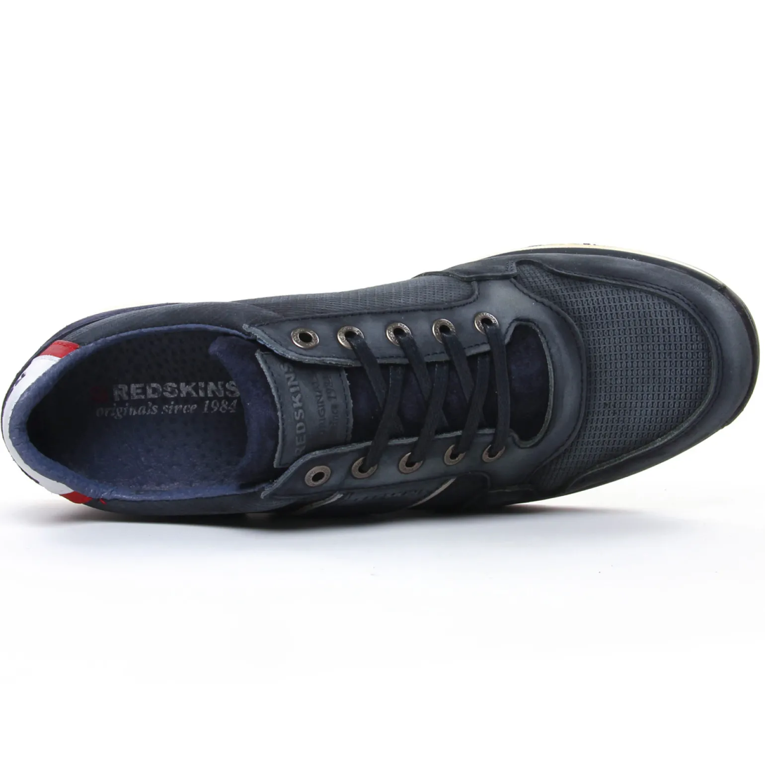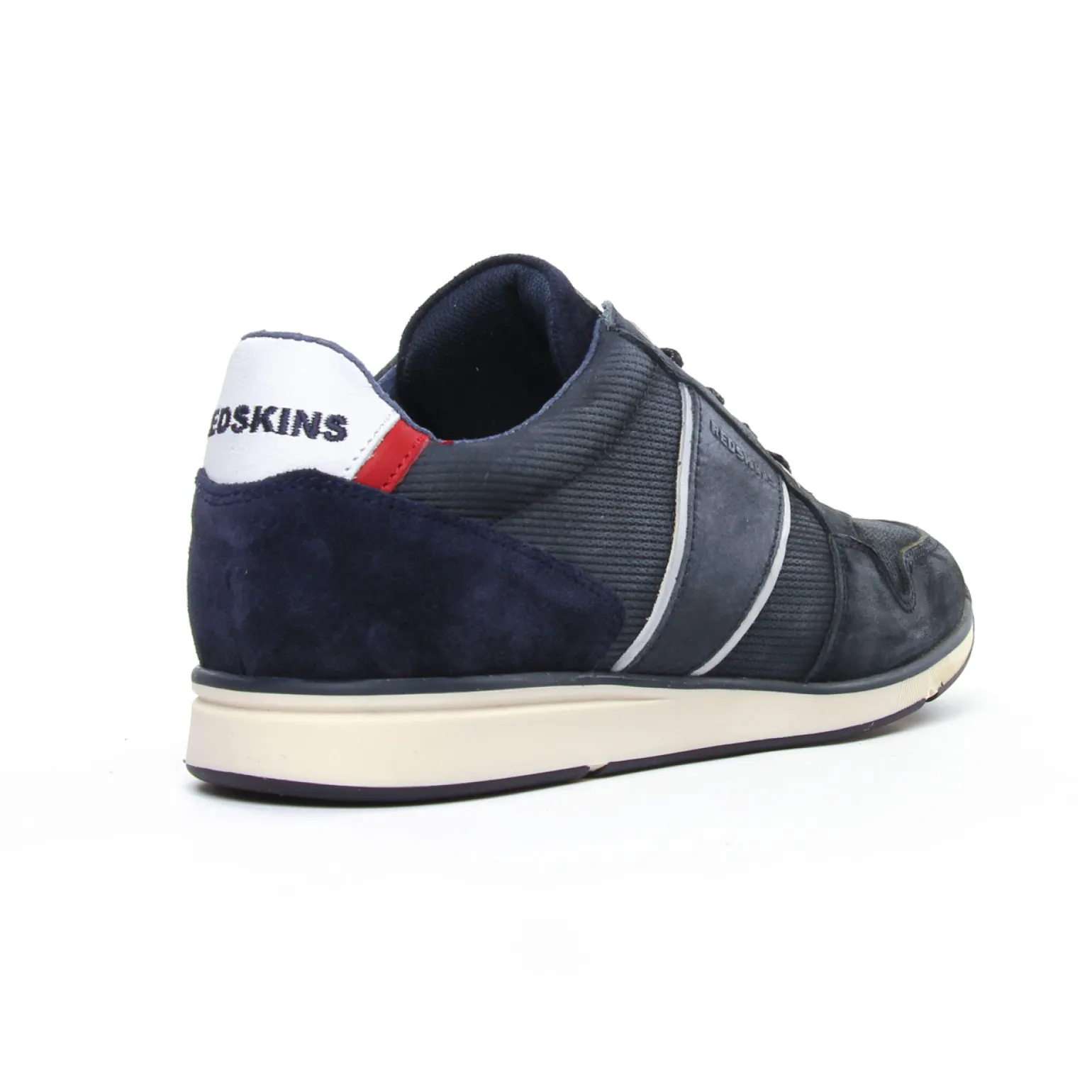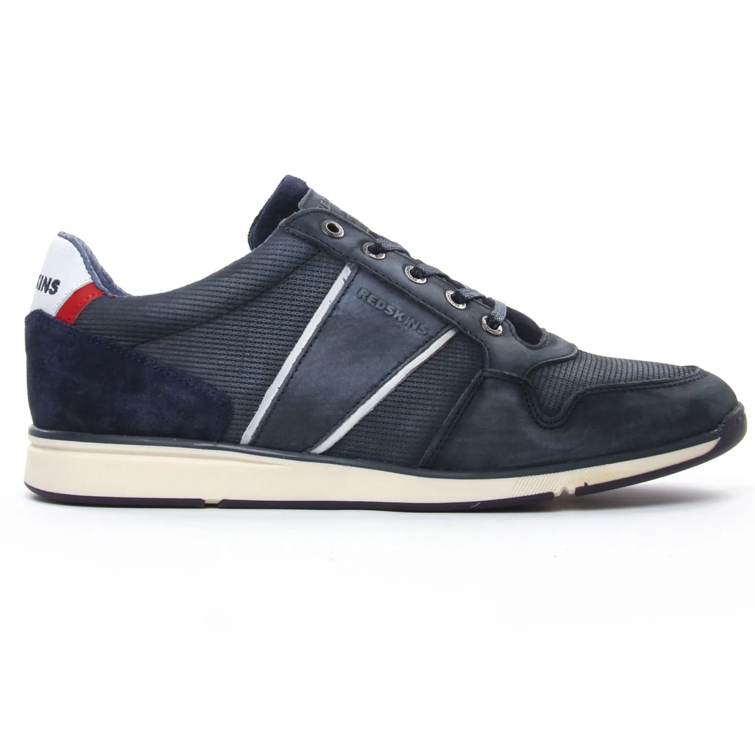 Tennis de la marque Redskins de couleur bleu marine. Sneakers en cuir et textile de la marque Redskins nouvelle collection été 2020, un cuir nubuck et un textile bleu marine, première textile, confort avec style selon Redskins, tennis en cuir nommées Chacra.