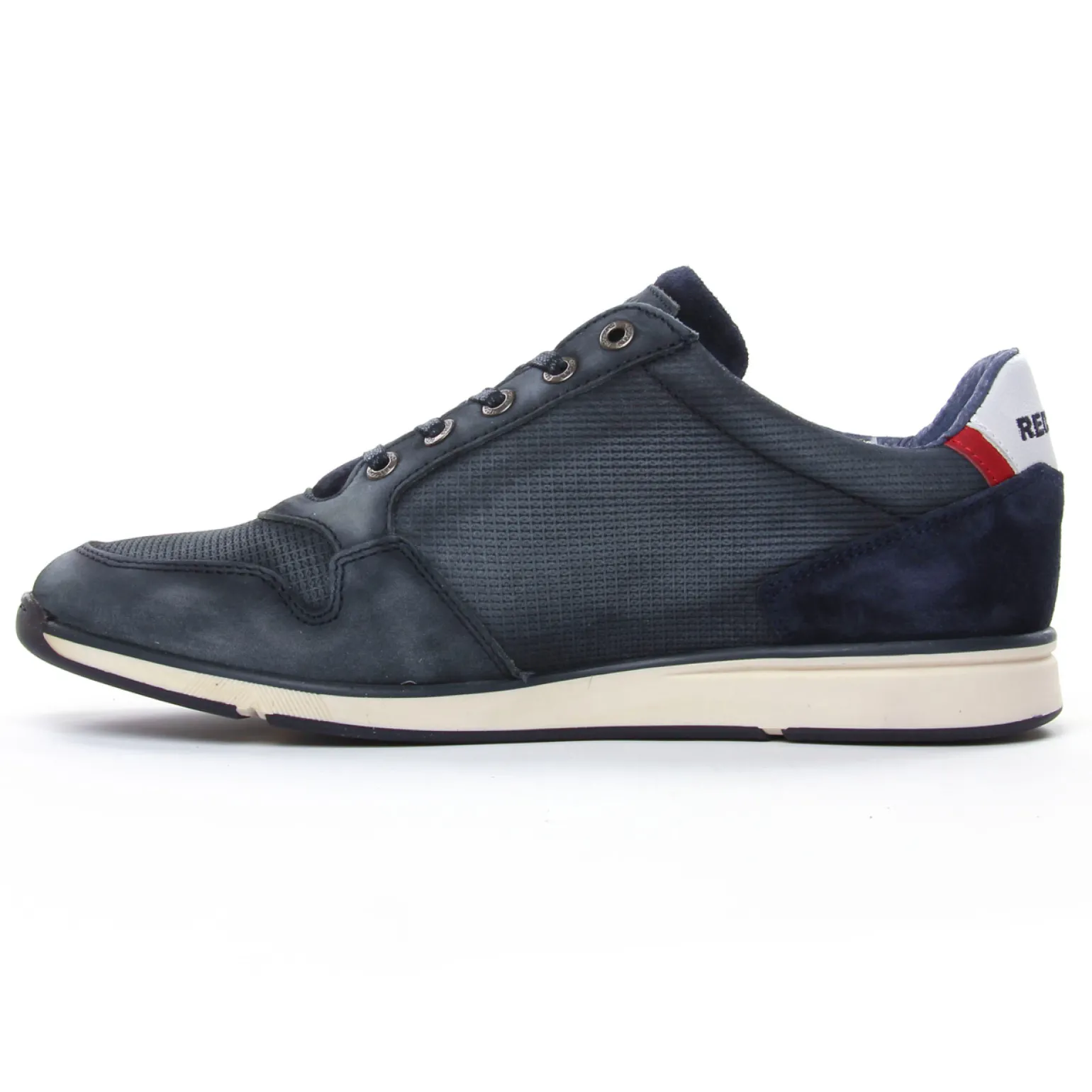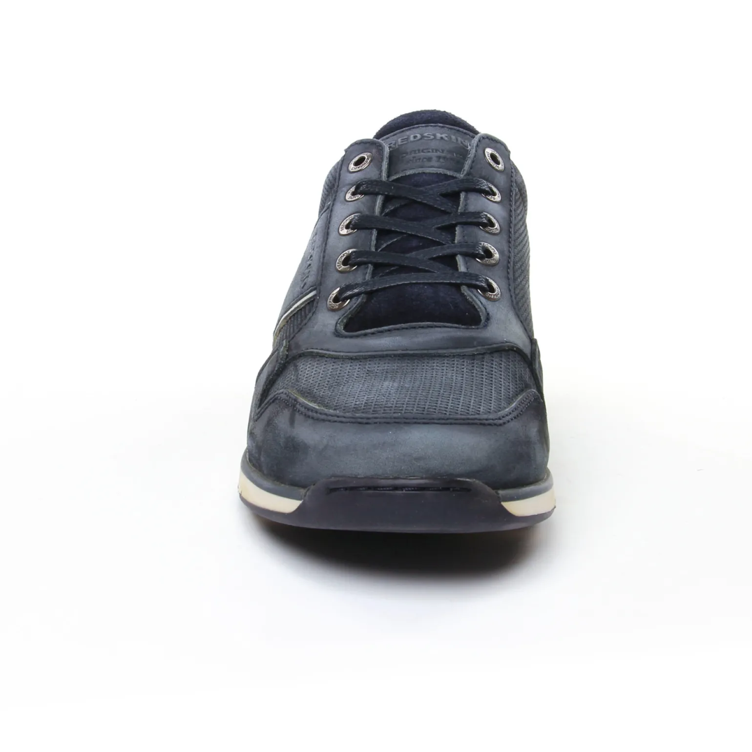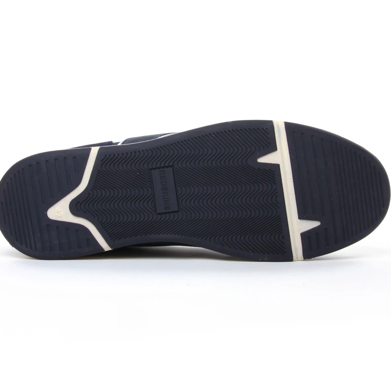 Tennis de la marque Redskins de couleur bleu marine. Sneakers en cuir et textile de la marque Redskins nouvelle collection été 2020, un cuir nubuck et un textile bleu marine, première textile, confort avec style selon Redskins, tennis en cuir nommées Chacra.
