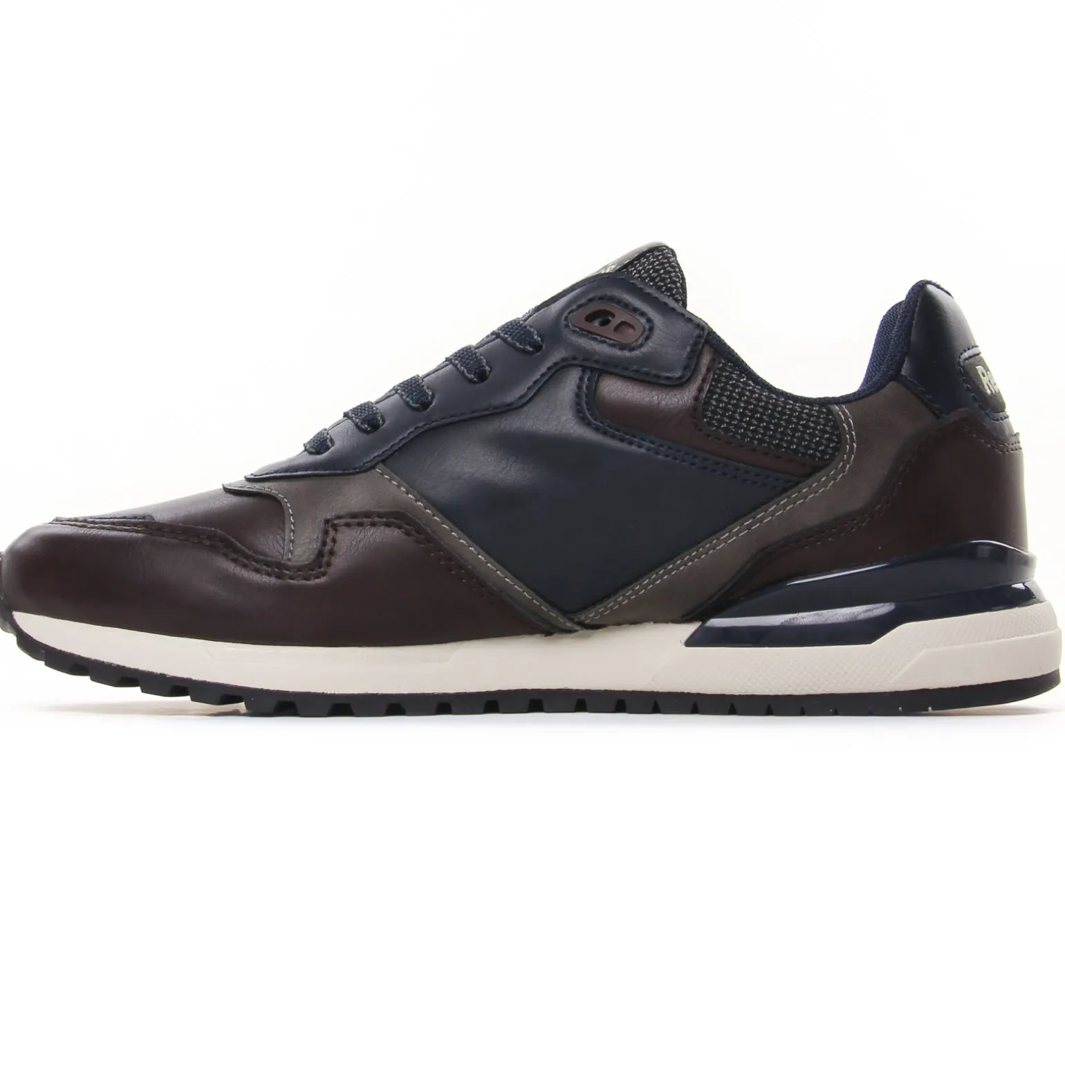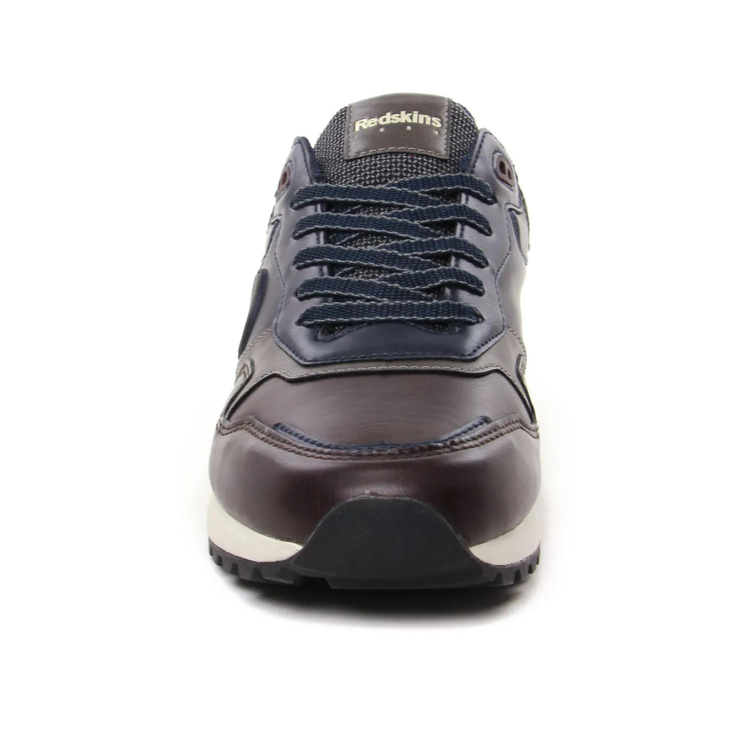 Tennis de la marque Redskins de couleur marron bleu marine. Sneakers en cuir bi-colore de la marque Redskins nouvelle collection automne hiver 2024, mariage d’un cuir marron et un cuir Kaki ou d’un cuir bleu marine et morraon foncé, doublure textile et première textile, du confort avec du style selon Redskins, tennis en cuir nommées Oyato.
