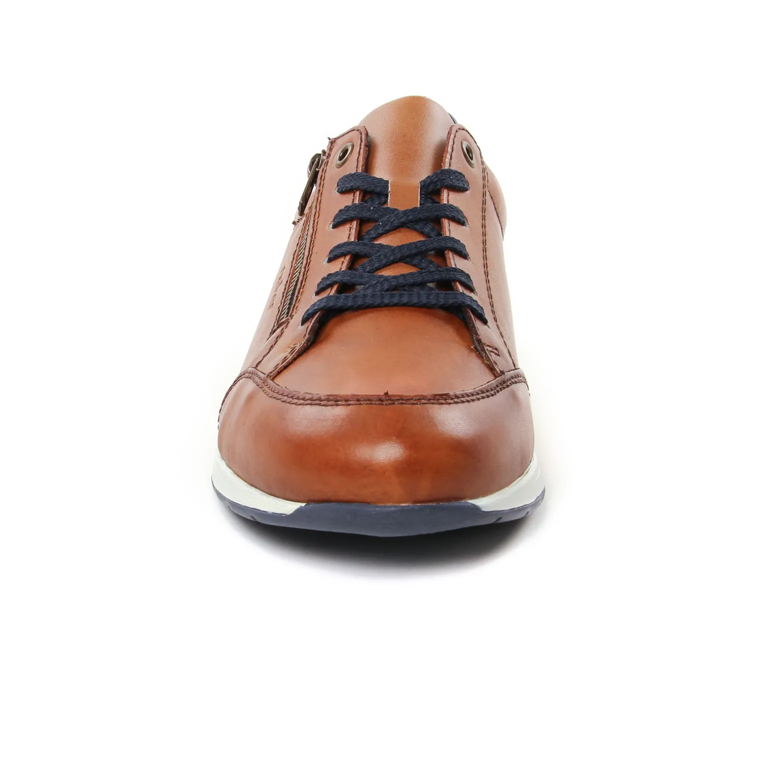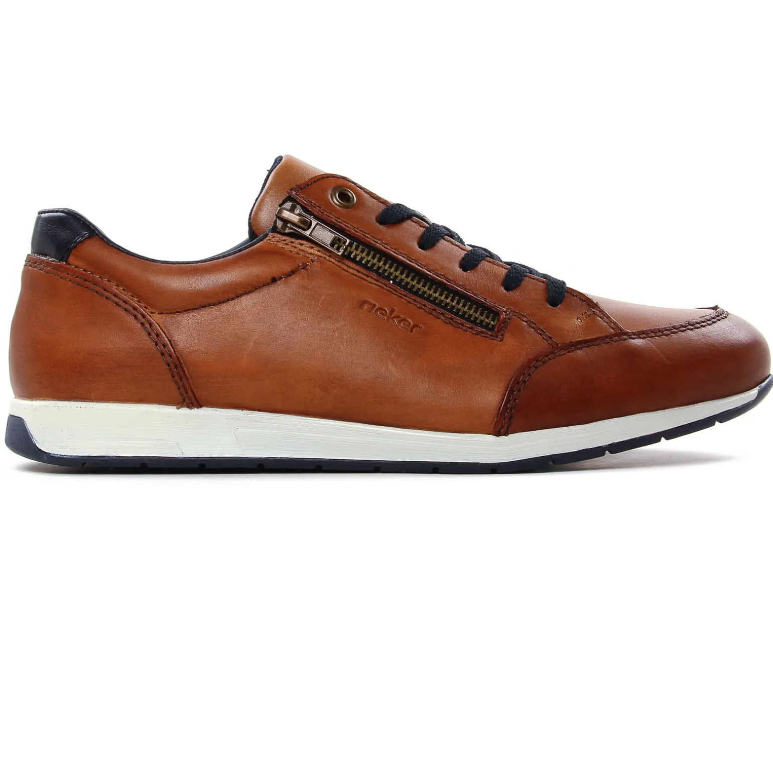 Tennis de la marque Rieker de couleur marron. Tige cuir dans une teinte cognac ou bleu marine, tennis cuir très confortables signées par Rieker, doublure textile, une première confortable en cuir, tennis nouvelle collection printemps été 2024 de chez Rieker.