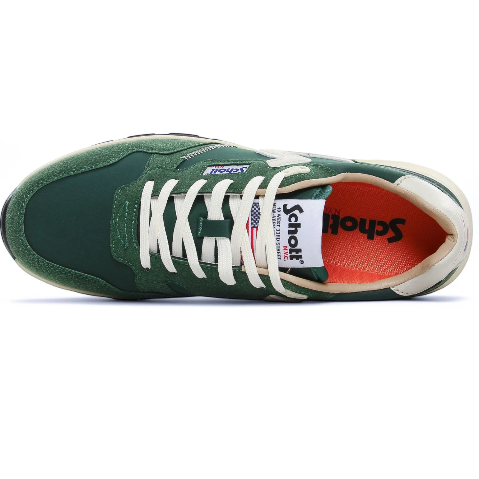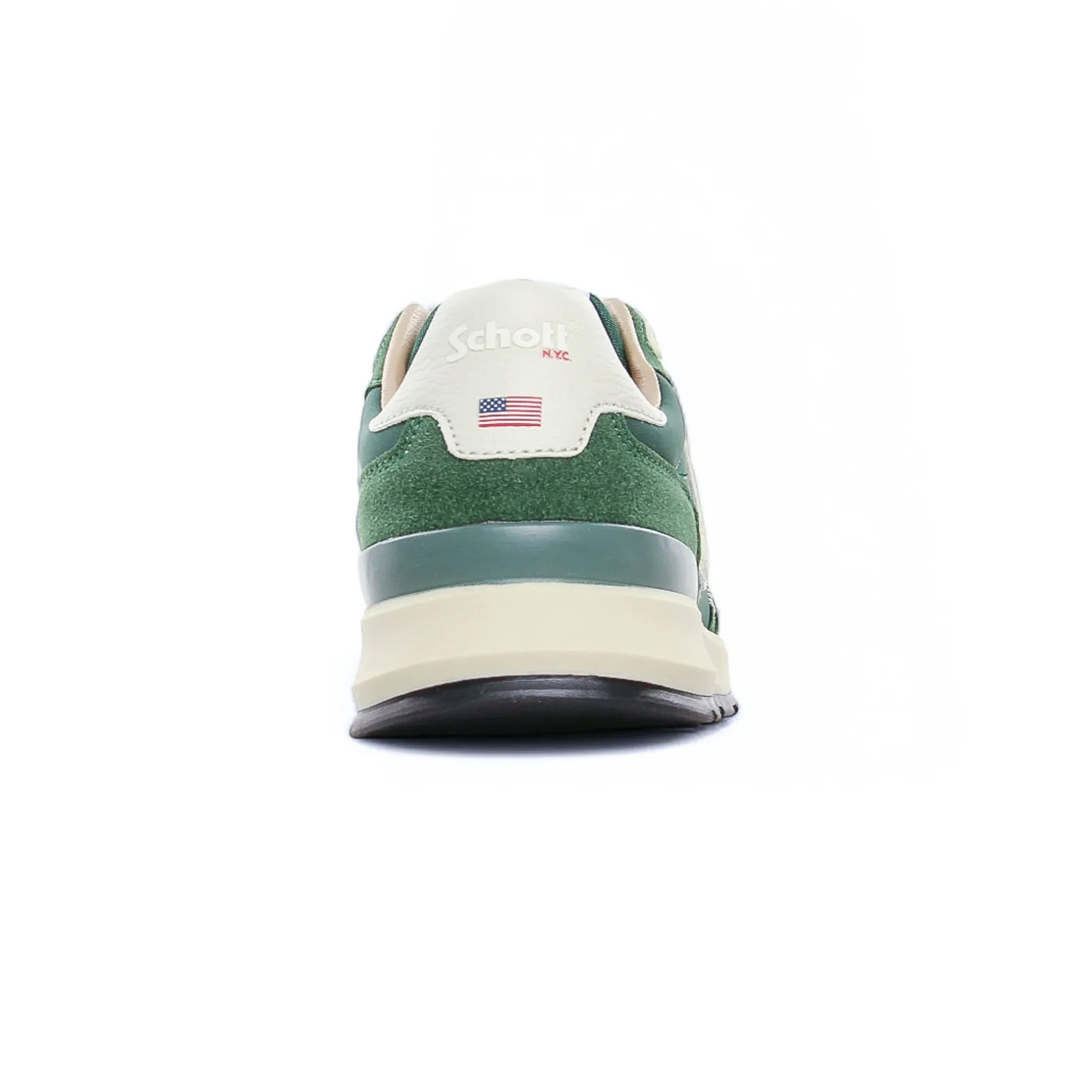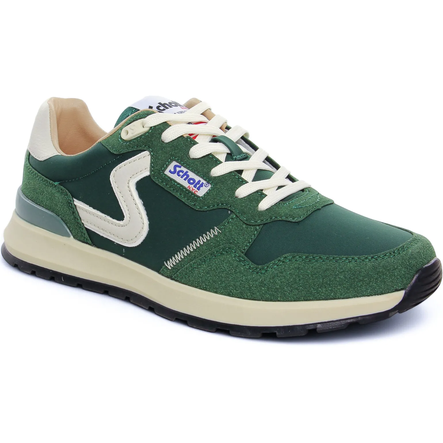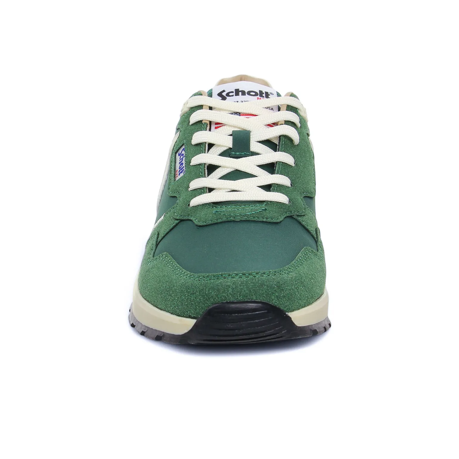 Tennis de la marque Schott de couleur vert blanc. Sneakers basses style running, tennis disponibles en marine, vert, jaune ou rouge pour cette nouvelle collection été 2025, lacets blancs, semelle texturée, une première amovible, un petit prix pour beaucoup de style !