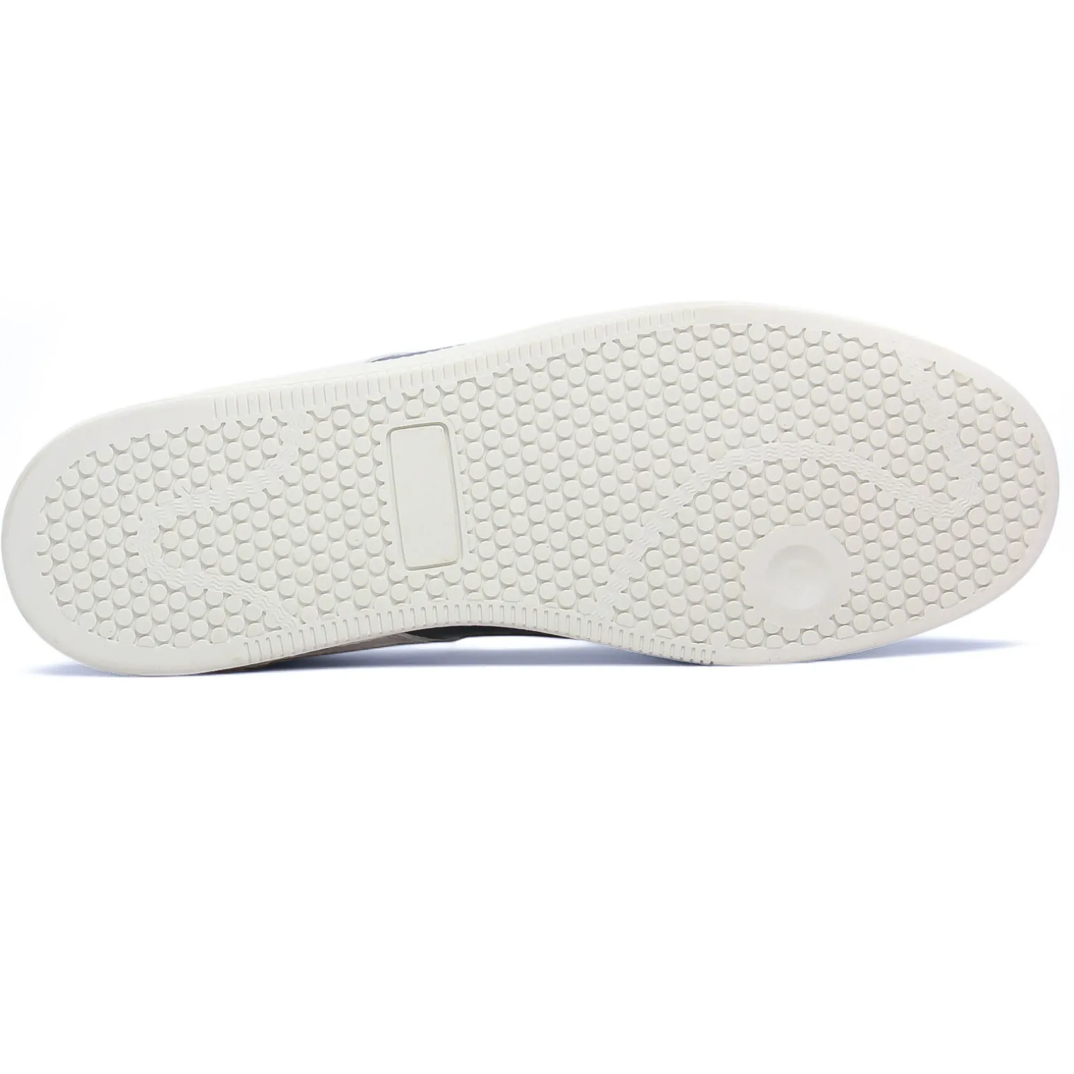 Tennis de la marque Schott de couleur blanc marine. Tennis basses blanches avec des insert leu marine, collection été 2025, lacets bleu marine, semelle en gomme souple, un petit prix pour beaucoup de style !