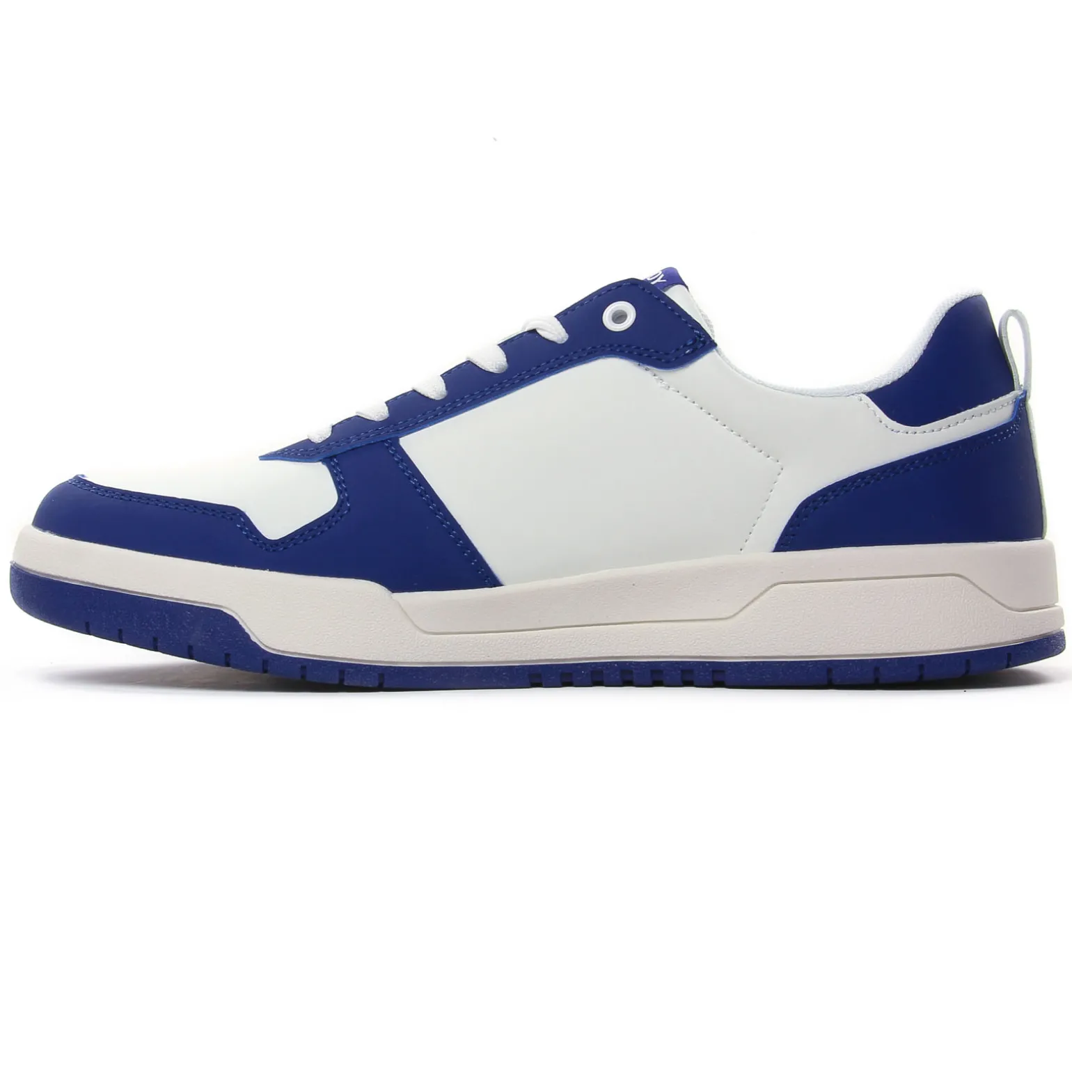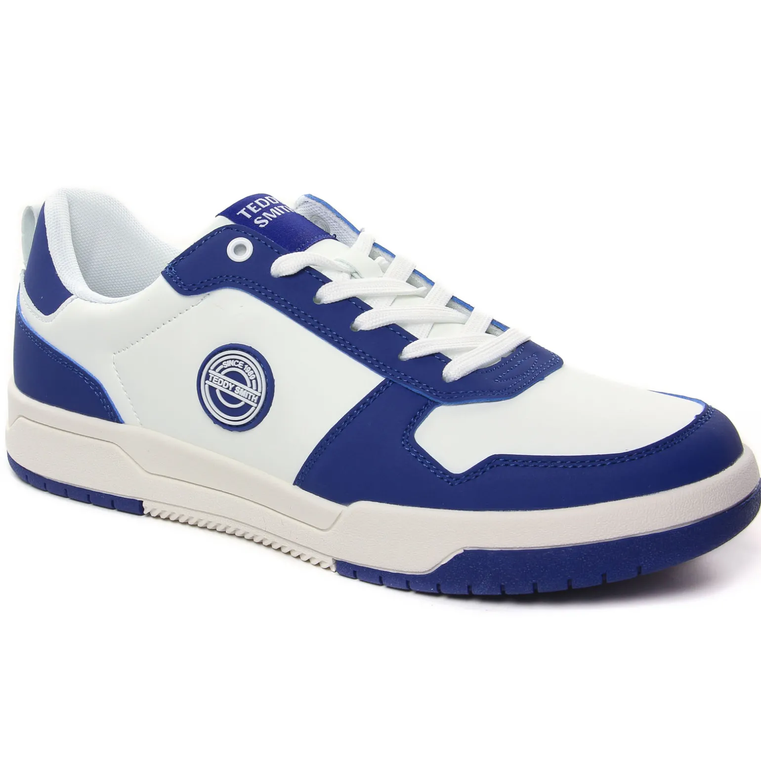 Tennis de la marque Teddy Smith de couleur blanc bleu. Une tige en simili blanc avec empiècements bleus, sur le coté le logo de la célèbre marque Teddy Smith, une semelle blanche, doublure et première textile, un prix démocratique pour beaucoup de style !